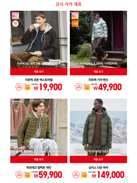 유니클로 감사제 세일 기간은 11월 28일(목)까지다. 감사제라고 전체 품목이 세일하는 것도 아니고, 감사제 바로 전날까지 세일하던 품목은 다시 정상가로 돌아오기도 했다. 동시에 전체 세일하면 안 되나 싶음.
