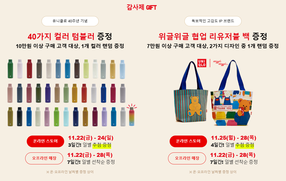 우선 감사제 기프트로는 10만 원 이상 구매자 대상으로 40가지 컬러의 텀블러 중 1개 컬러를 랜덤으로 증정한다. 또한, 7만 원 이상 구매 고객 대상으로는 위글위글과 협업한 리유저블 백을 제공한다. 둘 다 선착순이고, 온라인 스토어는 추첨으로 증정한다.