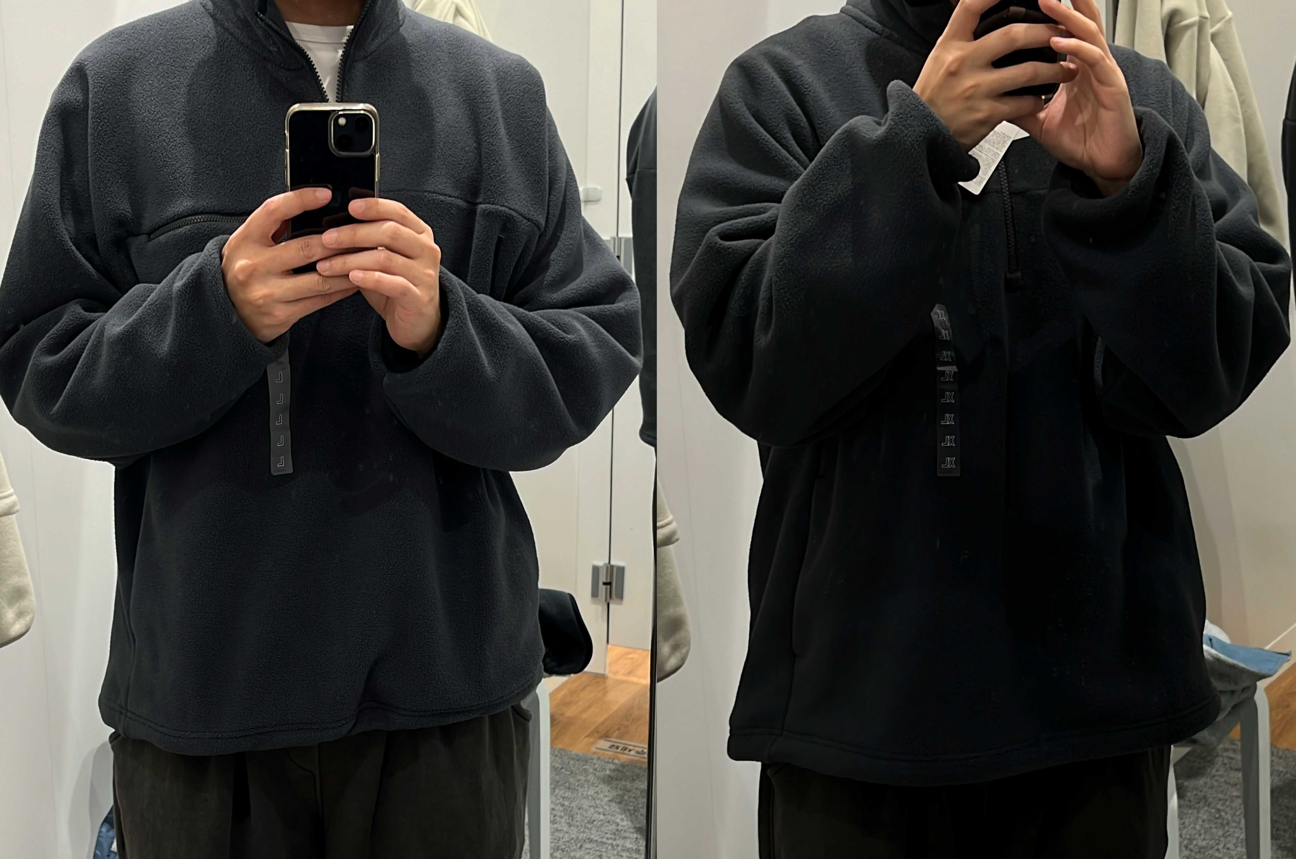 ✔후리스하프집오버사이즈풀오버 - 39,900원에서 29,900원으로 세일 중. 일단 걍 휘뚜루마뚜루 입을 수 있는 옷이다. 나는 원래 관심이 없었다가 유니클로 스타일힌트라고 스태프들이 입은 걸 보고 이렇게 입으면 예쁘겠다는 생각이 들어서 보고 왔다.