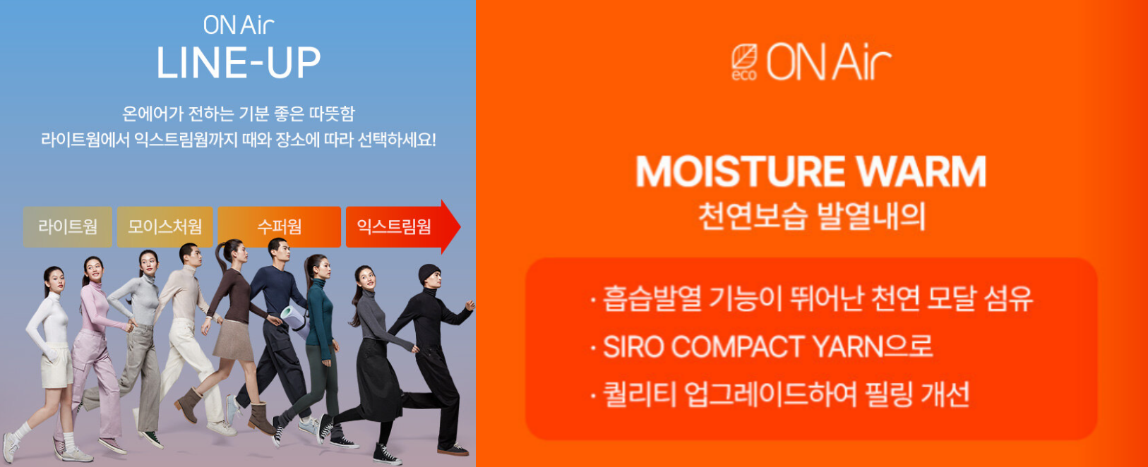 라인업은 가장 얇은 라이트웜에서 익스트림웜까지 있는데, 모이스처웜이 기본 히트텍 두께나 촉감이랑 비슷함