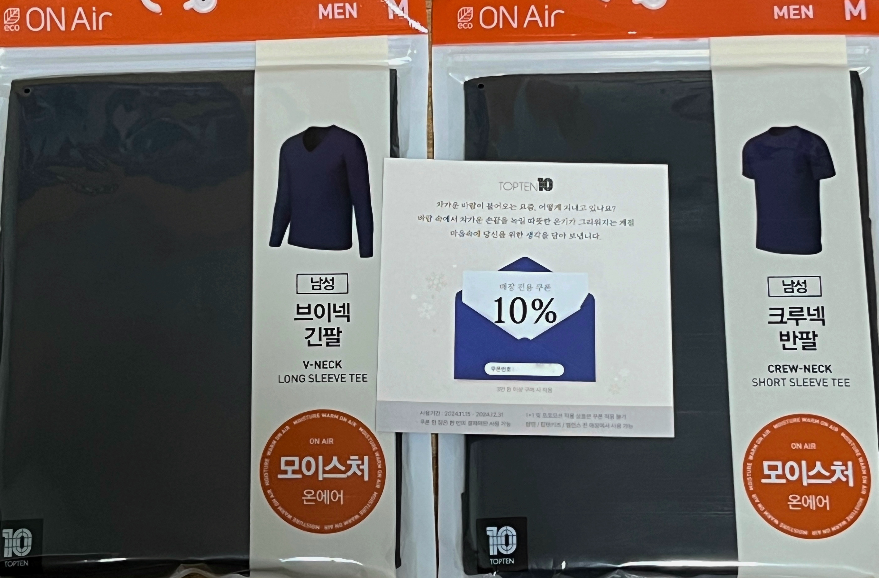 온라인으로 시켜서 배송을 받았는데 뭐 저렇게 텐셀모달, 파워핏, 친환경, 따뜻한 발열내의 등을 인증하는 택들이 들어있고, 함께 탑텐 매장에서 사용 가능한 10% 쿠폰을 준다. 1+1 행사 등과 같은 상품은 적용이 안됨. 12월까지 사용이 가능했던 것 같다.