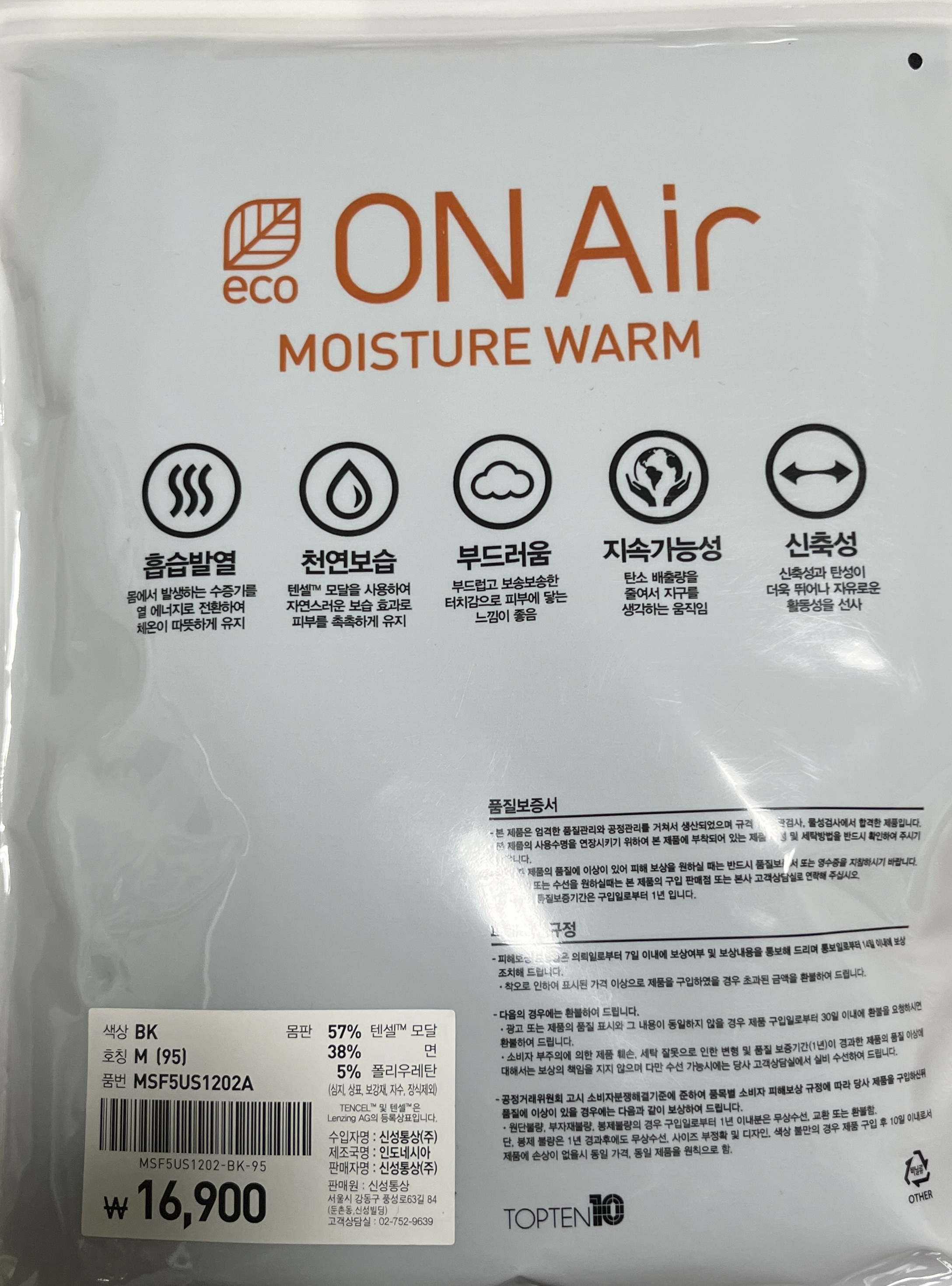 여전히 전통적인 강세는 유니클로 히트텍이지만 히트텍 가격도 많이 올라서 이제 안에만 입는 옷이니 가격이 상대적으로 저렴한 내의를 찾게 되긴 한다. 그래서 구입한 것이 탑텐 온에어 모이스처웜