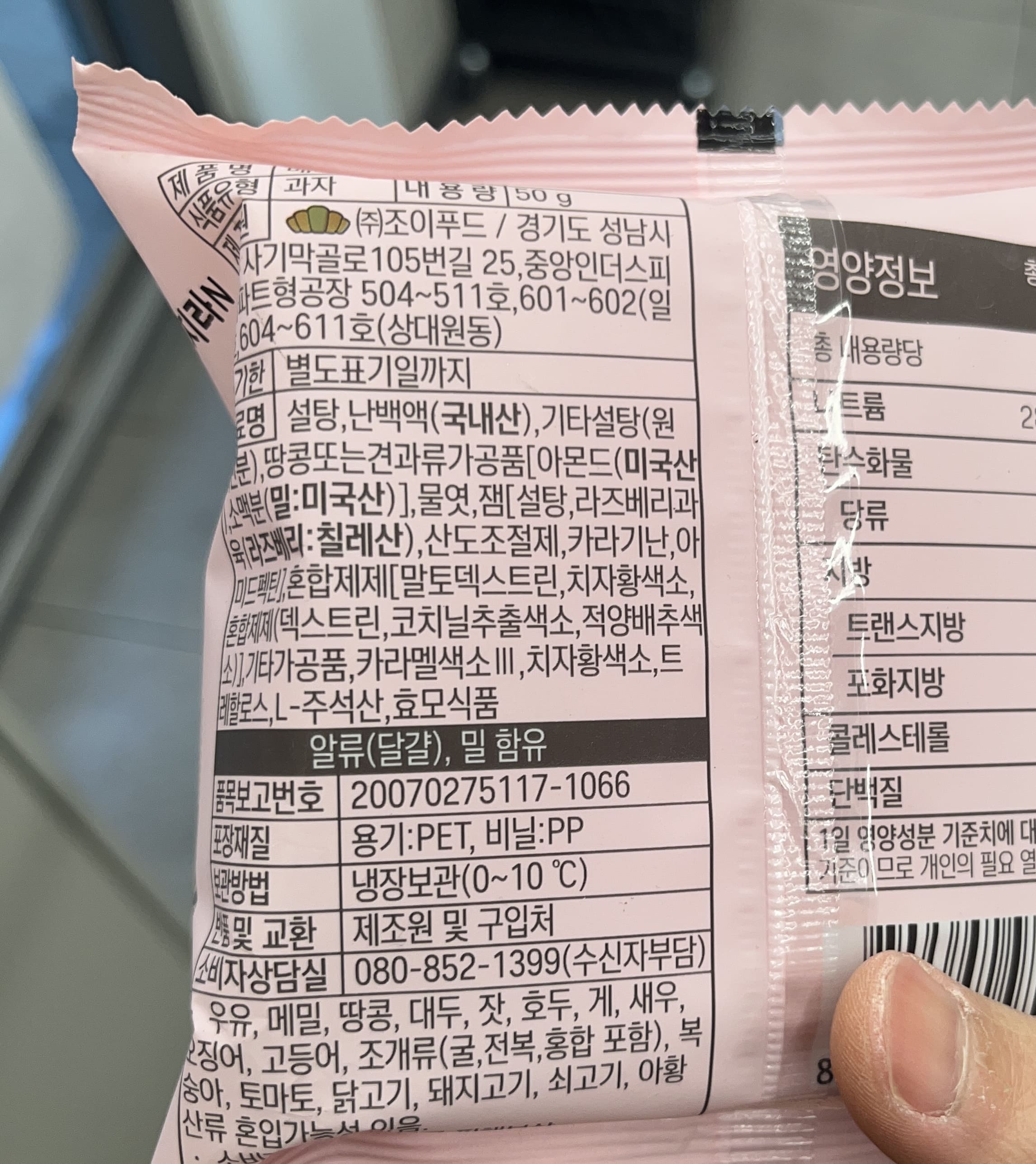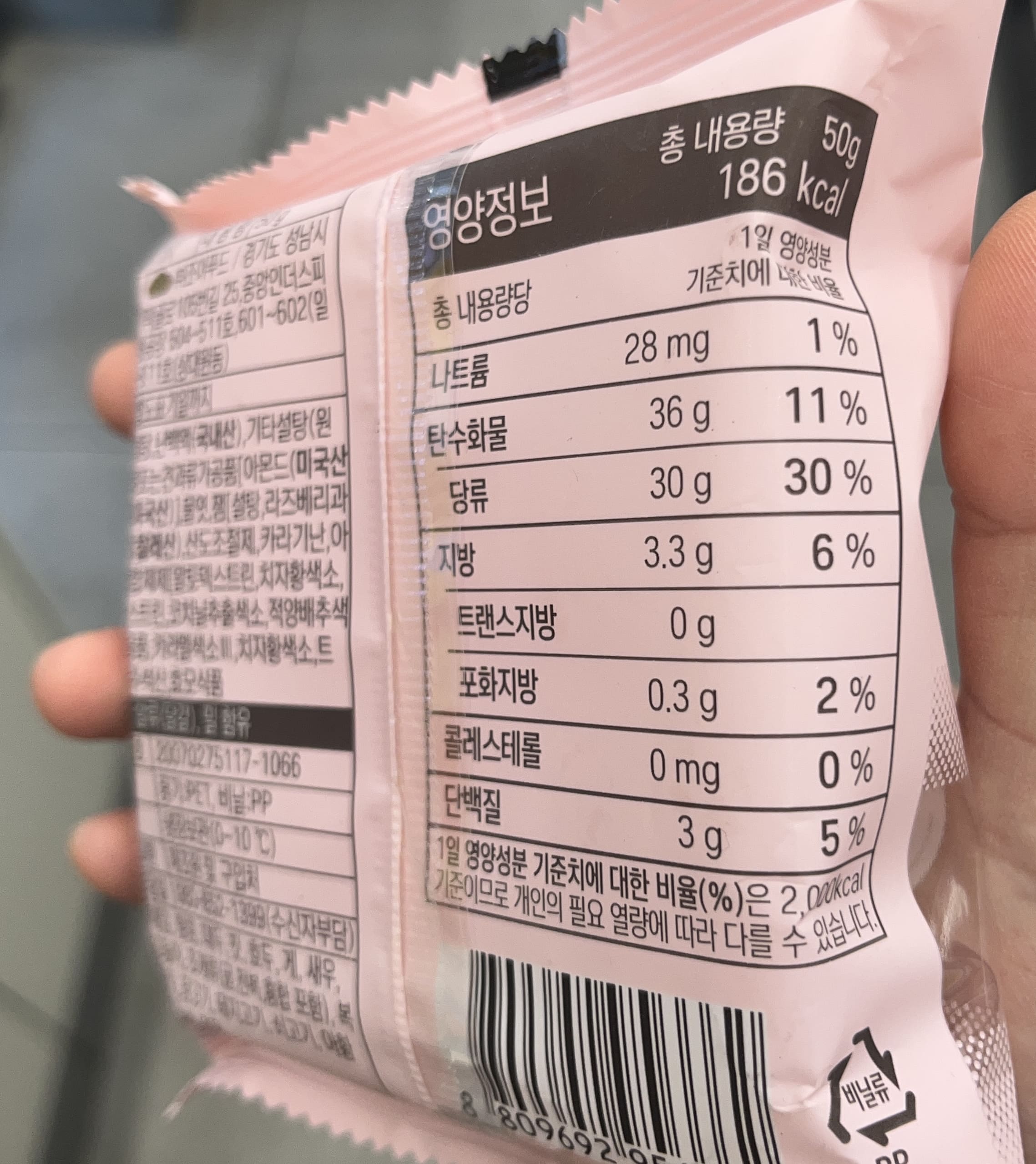 cu 베이크하우스 405 베리마시멜로우카롱 가격은 개당 1,800원. 크기가 큰 마카롱 1개로 마냥 싸다고 느낄 정도는 아니긴 하다. 열량은 50g 186칼로리. 당류는 일권장량 기준 30%, 나트륨 1%, 탄수화물 11%, 지방 6%, 포화지방 2%, 단백질 5%로 생각보다 포화지방 및 지방량이 적었다.