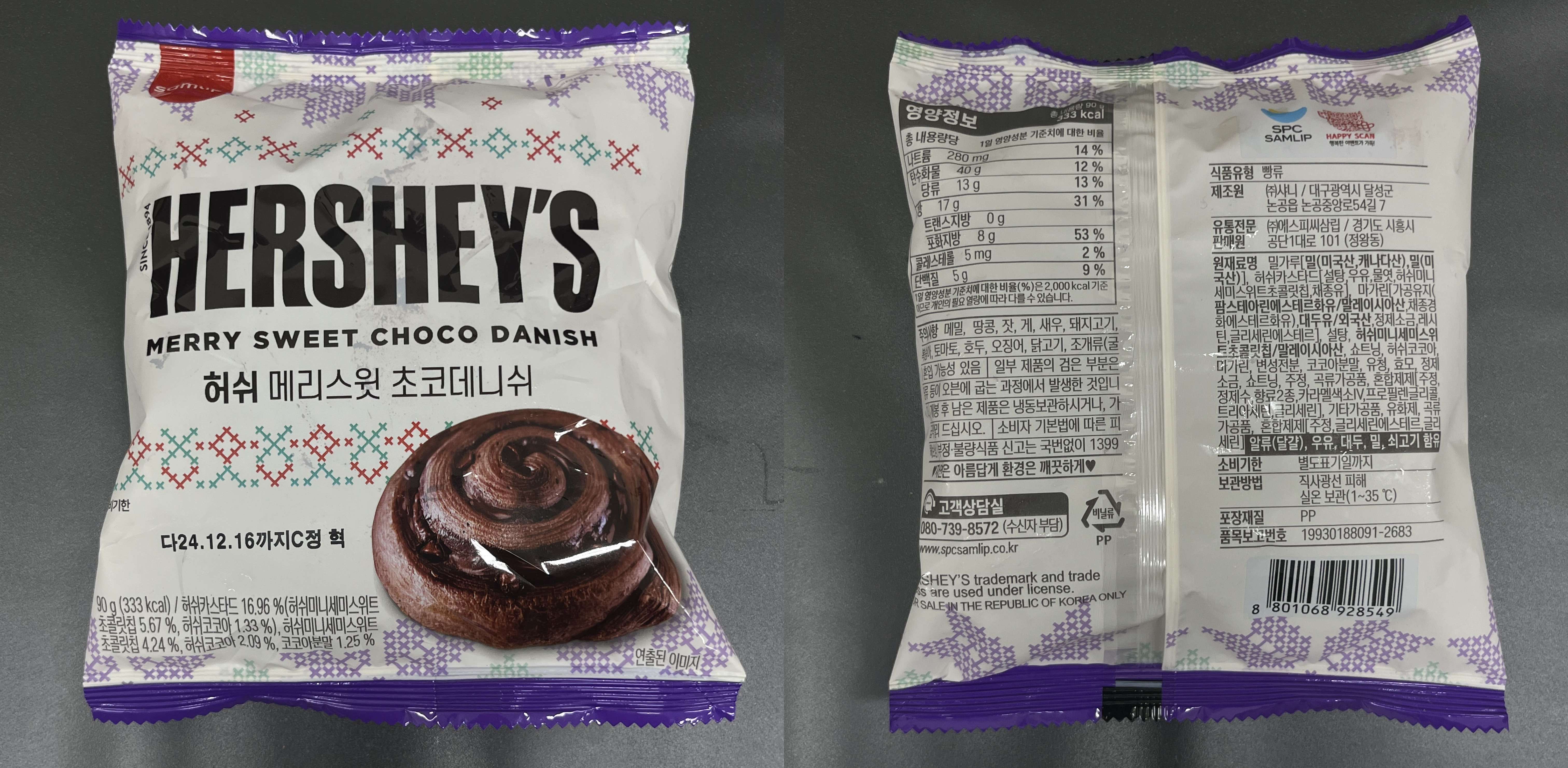 간단하게 끼니 떼우려고 편의점을 기웃거렸는데 눈에 띈 '허쉬 메리스윗 초코 데니쉬'. 포장지가 눈에 띄는 게 크리스마스 겨울 시즌 기념으로 나온 제품으로 보여진다.