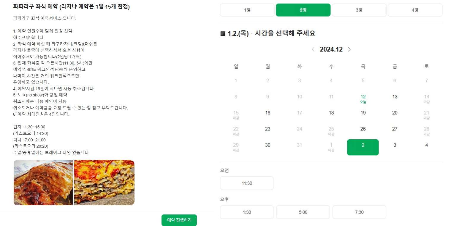 예약은 네이버에서 가능하며 11:30, 13:30, 17:00, 19:30 예약이 가능하다. 예약 인원 최대는 4명. 런치 및 디너 오픈시간인 11:30, 17시에는 예약석 40%, 워크인석 60%로 운영하고 그 외 시간은 워크인석 위주 운영하고 있다.