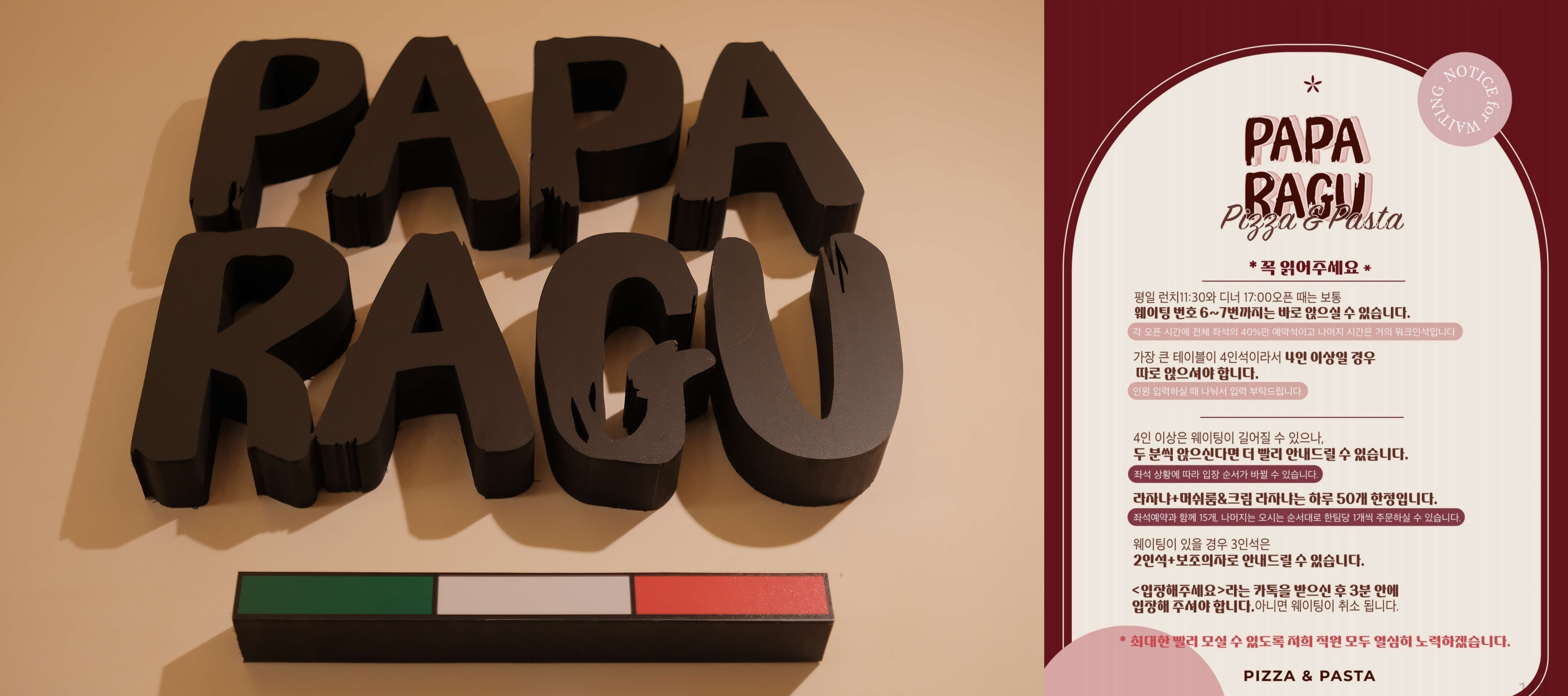 라구 라자냐는 파파라구의 시그니처 메뉴이다. ✔️라구는 간 고기를 오랫동안 볶고 거기에 토마토나 다른 걸 첨가하여 만든 것을 의미한다. ✔️반면, 토마토 베이스에 간 고기를 넣어서 요리한 것은 볼로네제이다. 둘 다 같은 뿌리에서 요리법이 조금씩 다른 것으로 알고 있다.