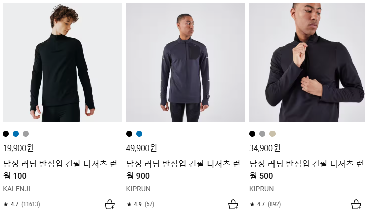 데카트론 남성 러닝 반집업 긴팔 티셔츠 런 웜 시리즈는 런 웜 100, 런 웜 500, 런 웜 900 이렇게 나누어져 있다.