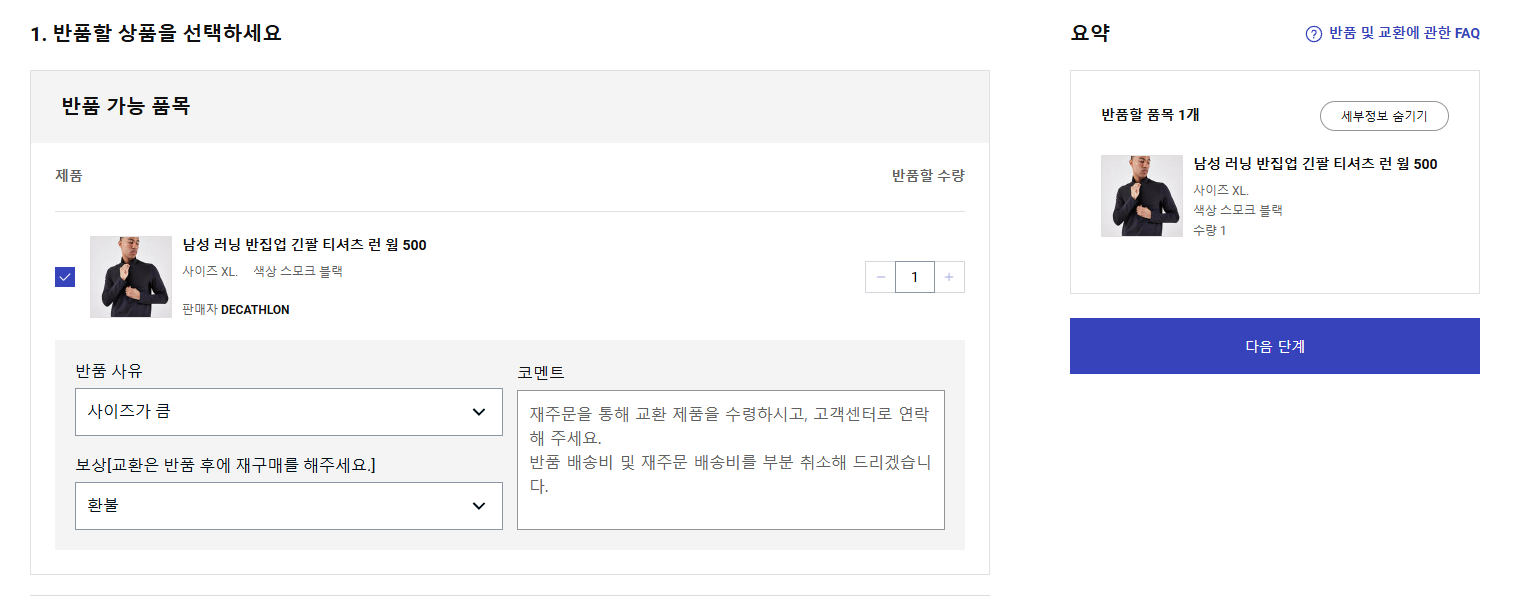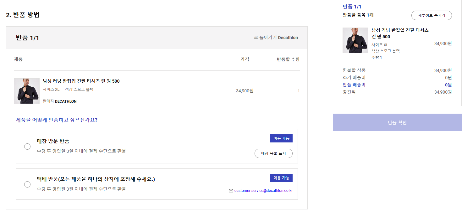 ✔️온라인에서 주문한 데카트론 제품은 주문 상세 정보에서 반품할 상품 및 사유를 선택한다.