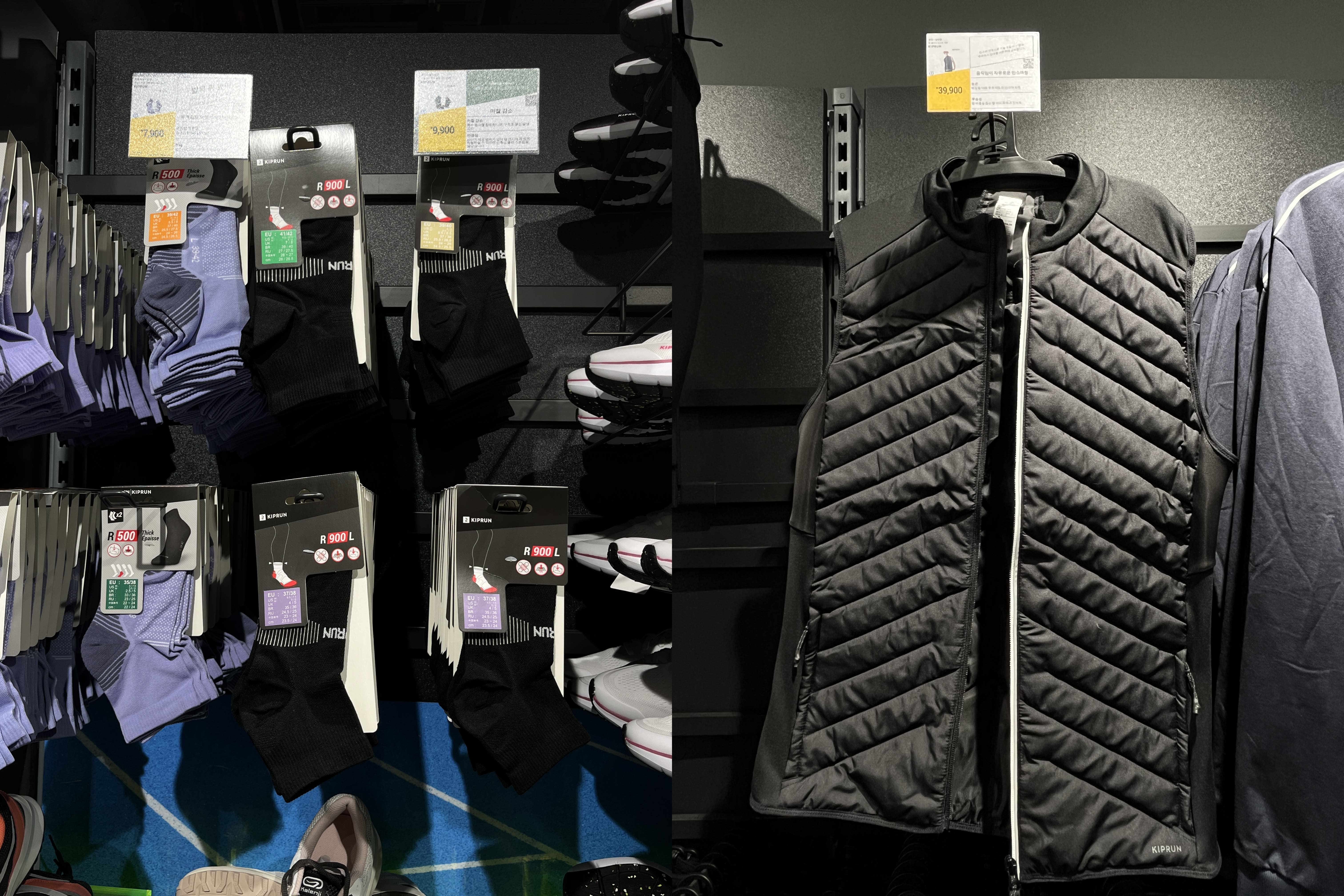 전반적으로 매장이 크다. 사이즈 같은 경우 실측이 기재되지 않아 매장 방문이 가능하다면 입어보고 사는 것이 낫다. 예를 들어 이번에 구매한 러닝 반집업 긴팔 티셔츠 런 웜 100 XL 사이즈는 런 웜 500 L 사이즈와 동일하다. 데카트론 양말 또한 두께감이 어떤지 알기가 어렵기에 한번 살펴보는 것도 나쁘지 않다.