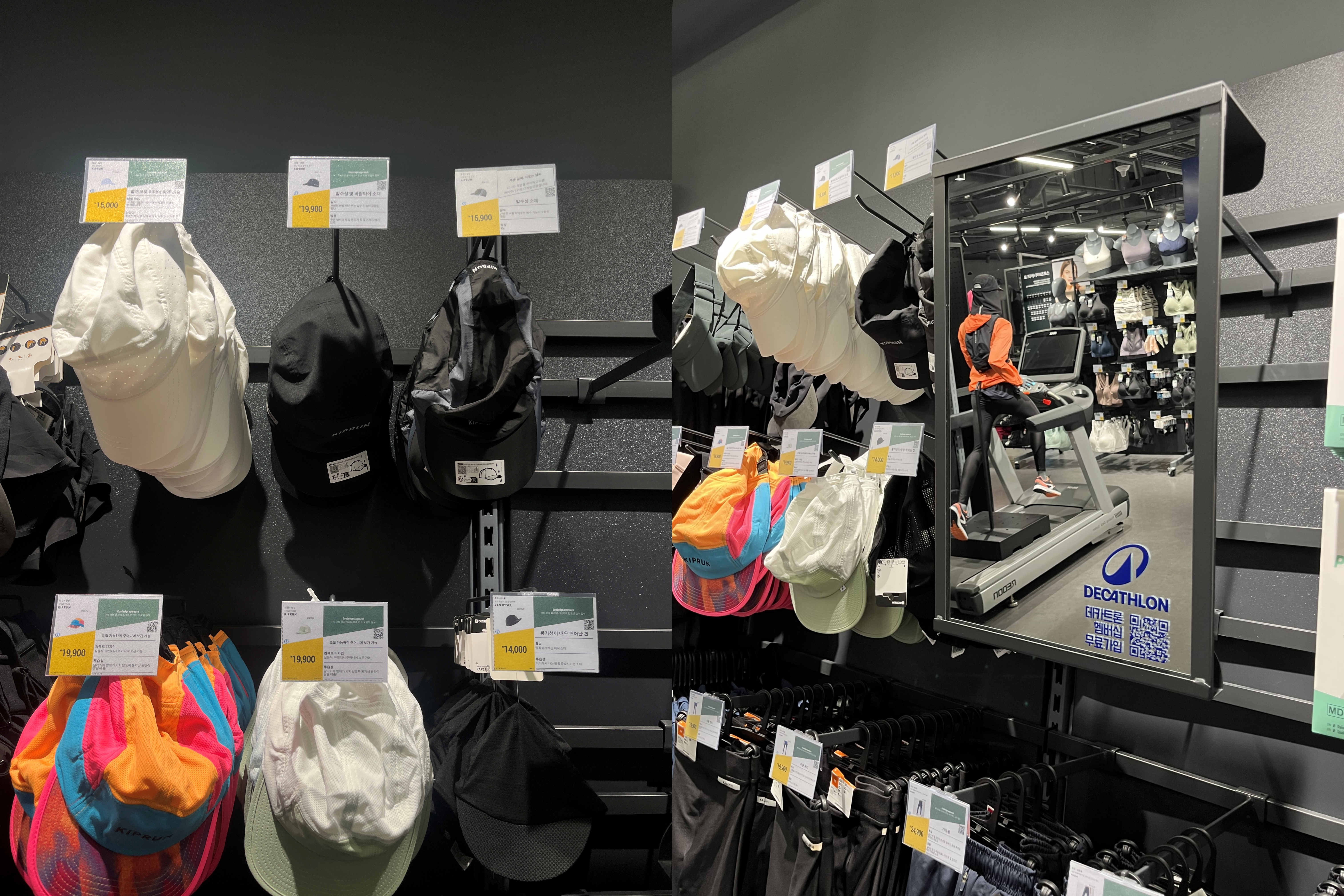 모자나 안경 등이 있는 곳에는 살펴보기 쉽게 거울이 있다. 가장 꾸준하게 나가는 기본 러닝 모자는 하얀색만 있었고 다른 색상은 없었다.