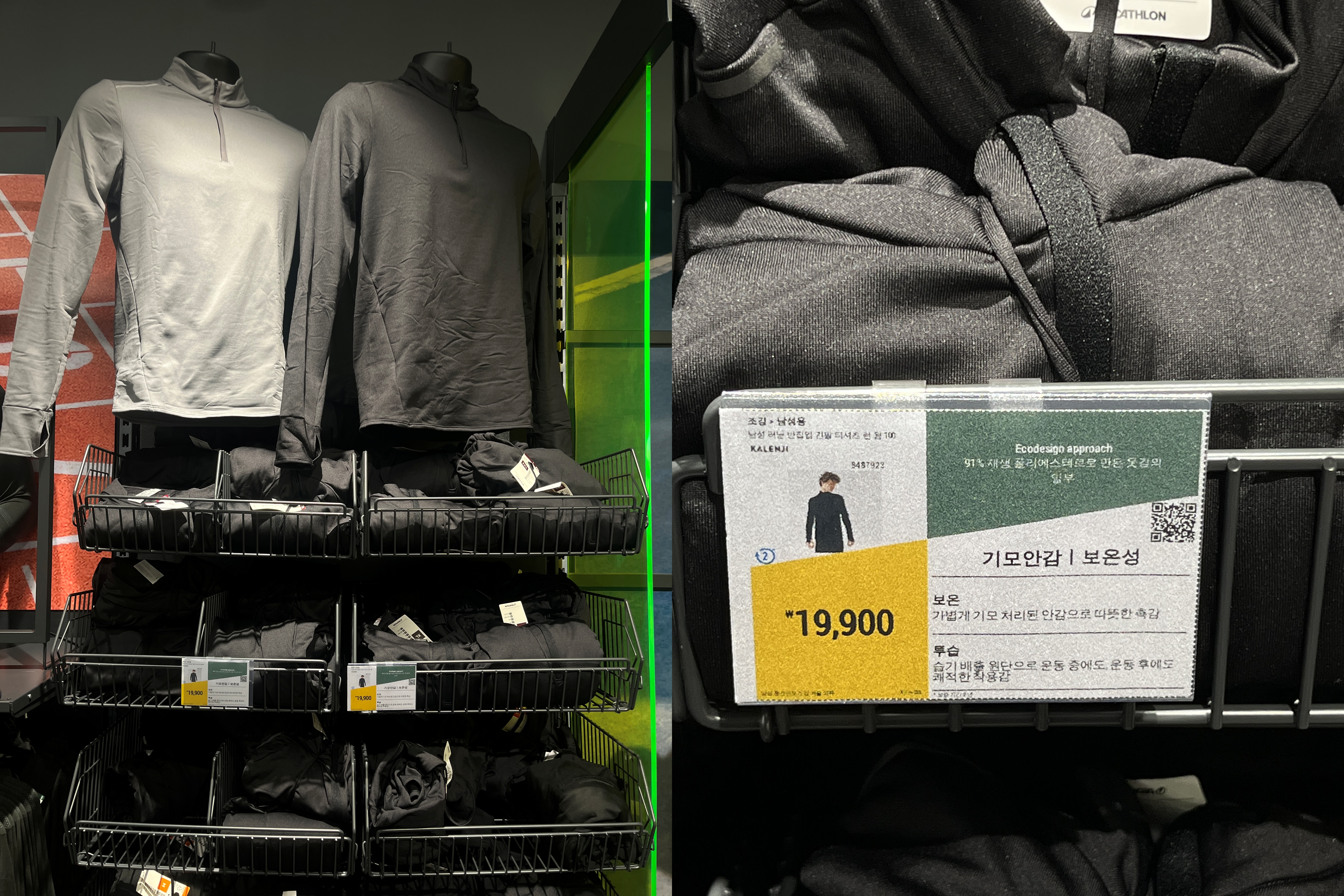 바깥쪽에는 러닝 반집업 긴팔 티셔츠 런 웜 100을 판매하고 있다. 런 웜 500 및 900은 매장에 아예 진열조차 돼있지 않았다. 사이즈는 S~2XL까지 있었음