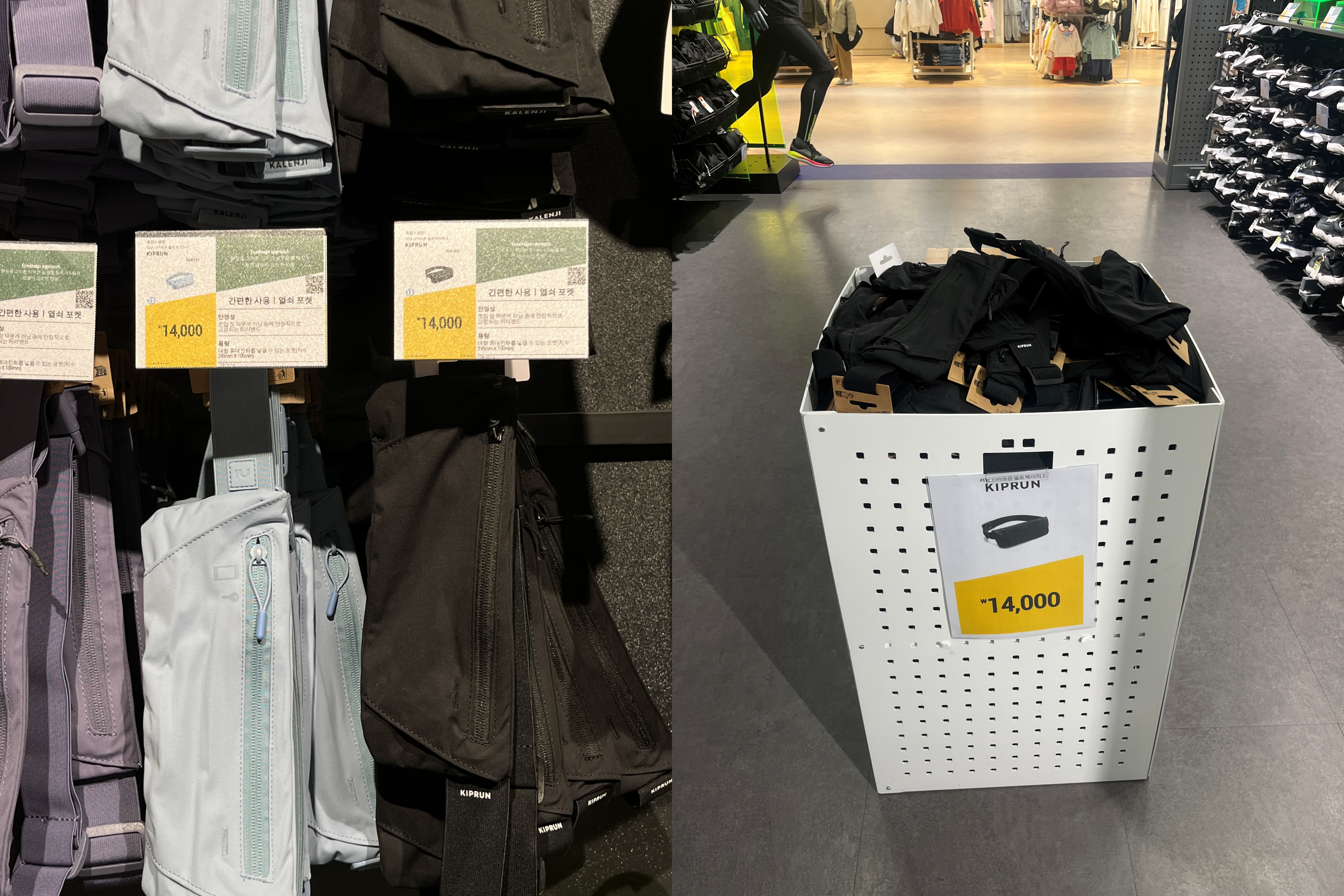 이중 킵런은 데카트론에서 전개하는 러닝 브랜드이다. 나는 킵런 쪽 위주로 둘러봤다. 한참 가을이 시작되는 시즌에는 데카트론의 러닝 벨트도 품귀현상이 보였었는데 겨울이라 비수기라 그런지 재고가 많다. 많이 찾아서인지 큰 바구니에 아예 담아놔서 진열도 해놨다.