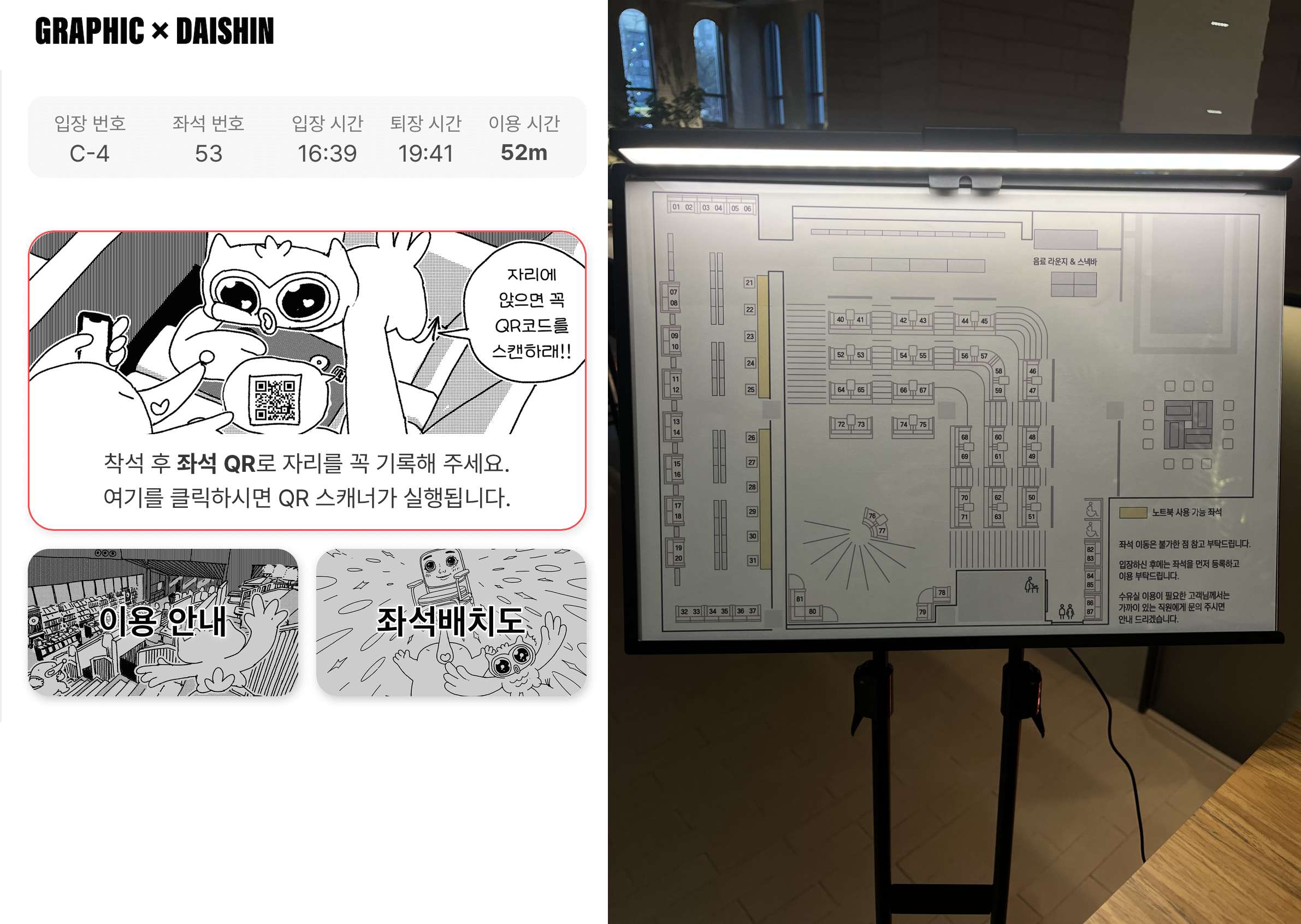 입장 시에 먼저 선결제를 하고 카운터에서 QR 코드를 찍는다. 그리고 좌석 안내를 받은 뒤에 해당 좌석에 착석 후에 거기에 있는 QR 코드를 찍어주면 그 자리가 본인 지정이 된다. 해당 자리 및 이용시간, 잔여 시간 등과 이용 안내를 확인할 수 있다.