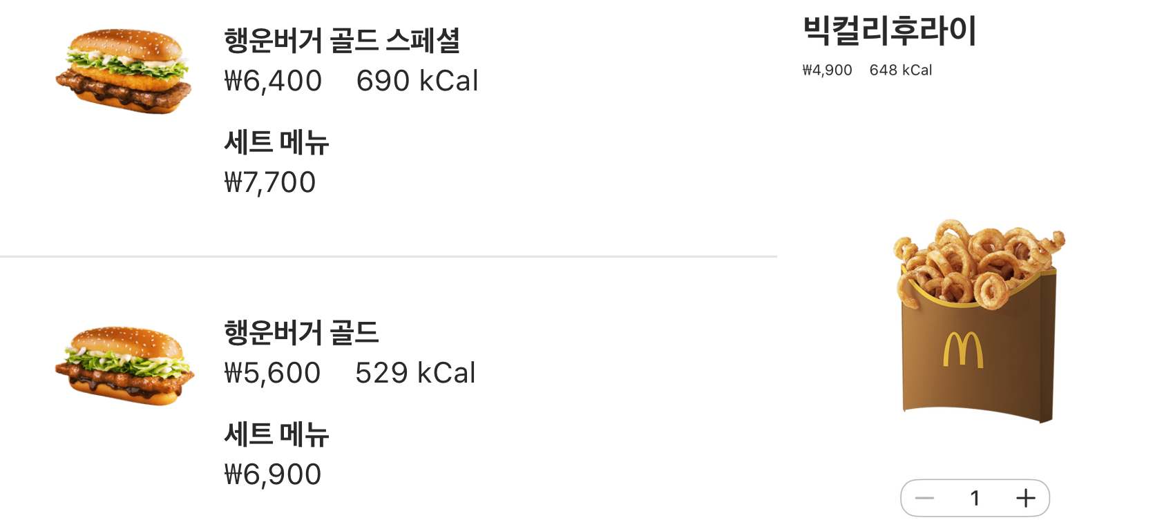 맥도날드 행운버거 골드 및 컬리 후라이 단품