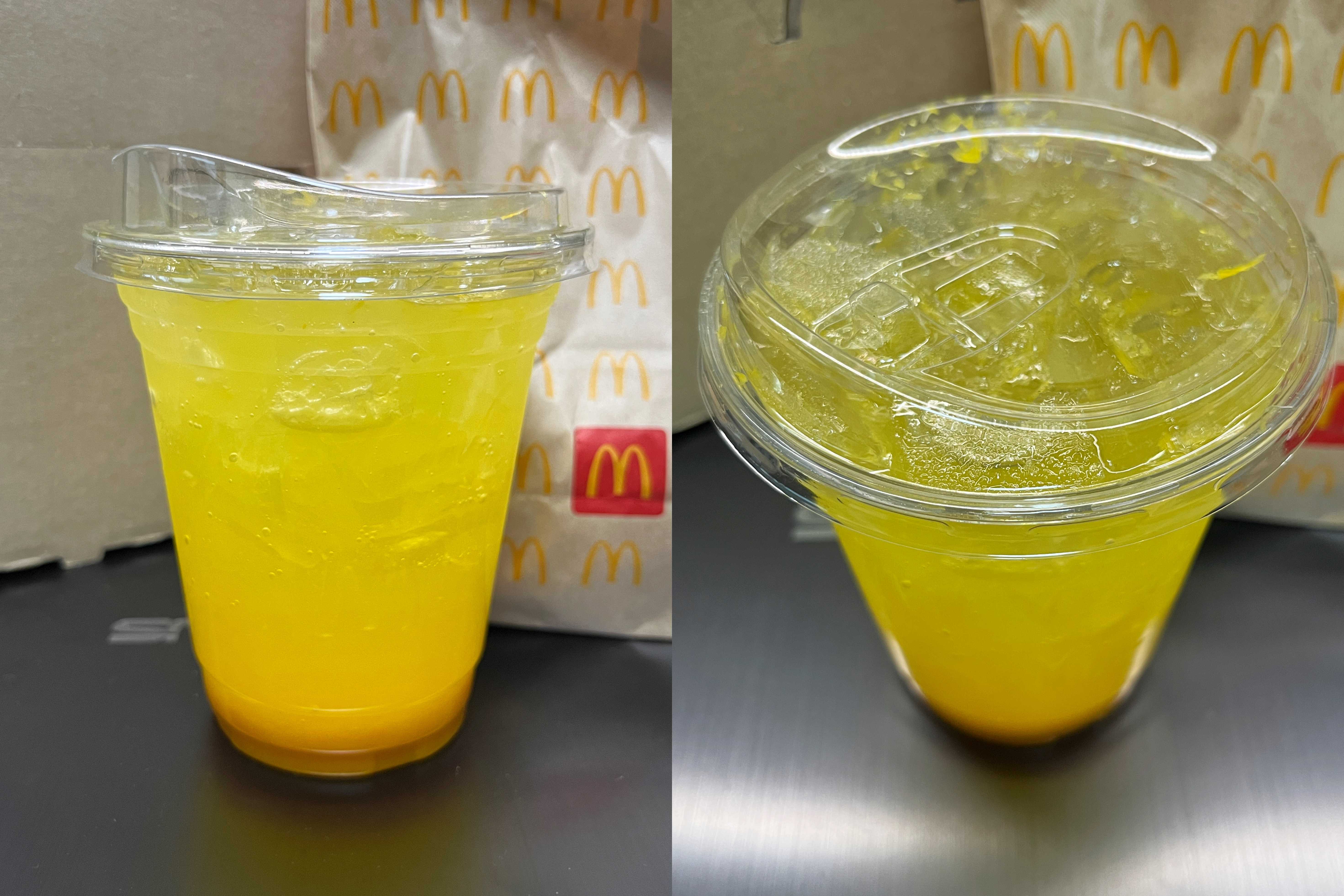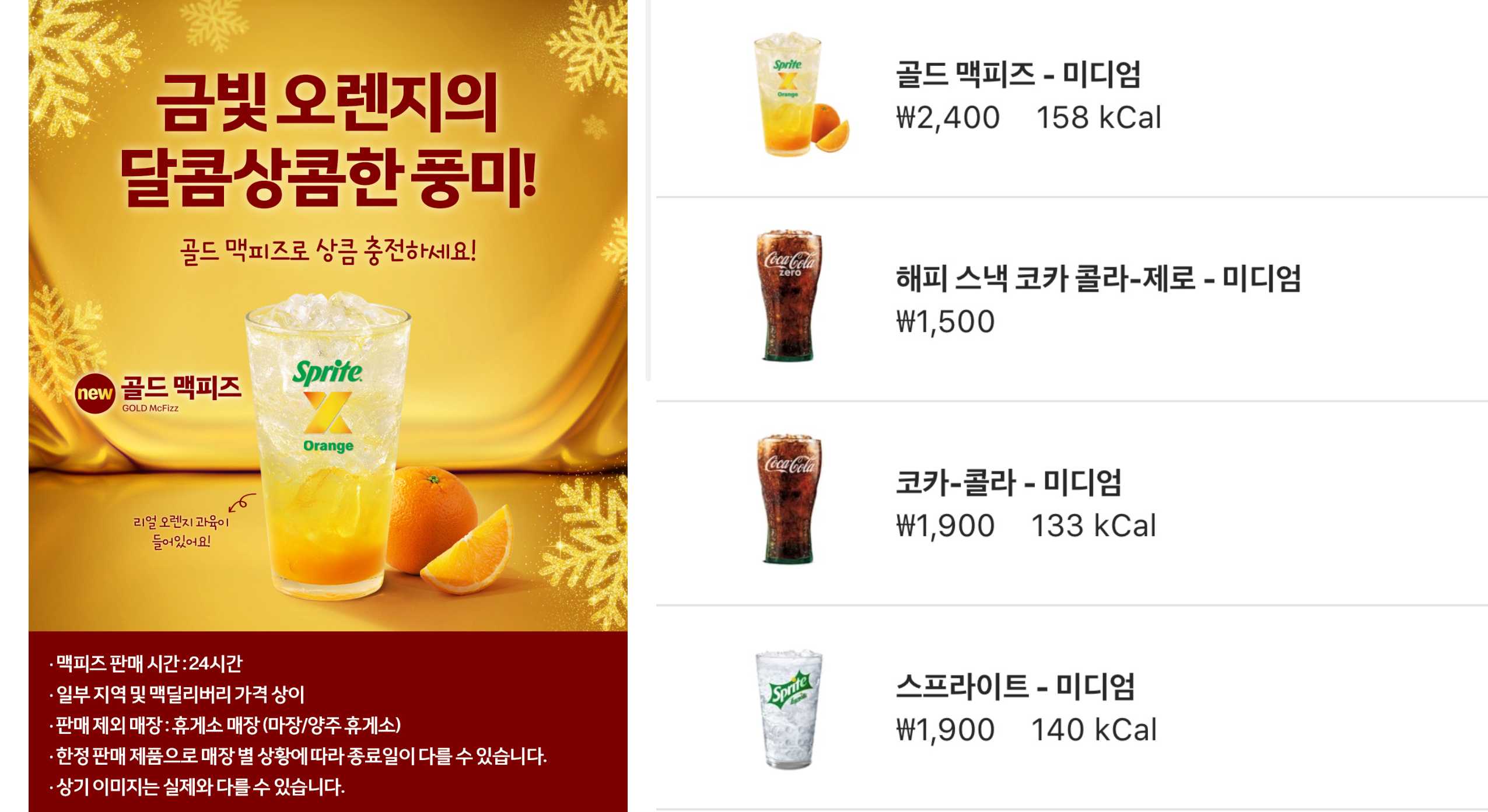 골드 맥피즈는 스프라이트 + 오렌지 과육이 섞인 음료이며 스프라이트 140칼로리, 오렌지 과육이 18칼로리 정도 된다.