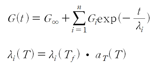 GMM의 수식은 아래와 같고, aT는 shift factor이다. 이동 지수는 탄성률 변화 예측을 위해 사용되는 수식이라고 보면 된다. 이동 지수는 WLF 혹은 아레니우스 수식을 이용한다. 그리고 이를 통해 시간에 따른 relaxation modulus를 예측할 수 있다. 측정은 유변학 물성 분석기기인 레오미터나 DMA를 이용한다. 이전에 점탄성에 대한 글을 썼으니 참고하면 좋다.