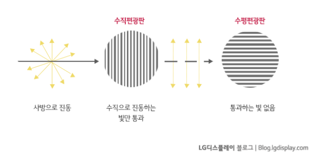 그래서 필요한 것이 편광판이다. 편광판은 무질서하게 뻗어나가는 빛을 일정한 방향으로 나갈 수 있게 하는 문과 같다. 일정한 방향이 아닌 빛은 차단당한다.