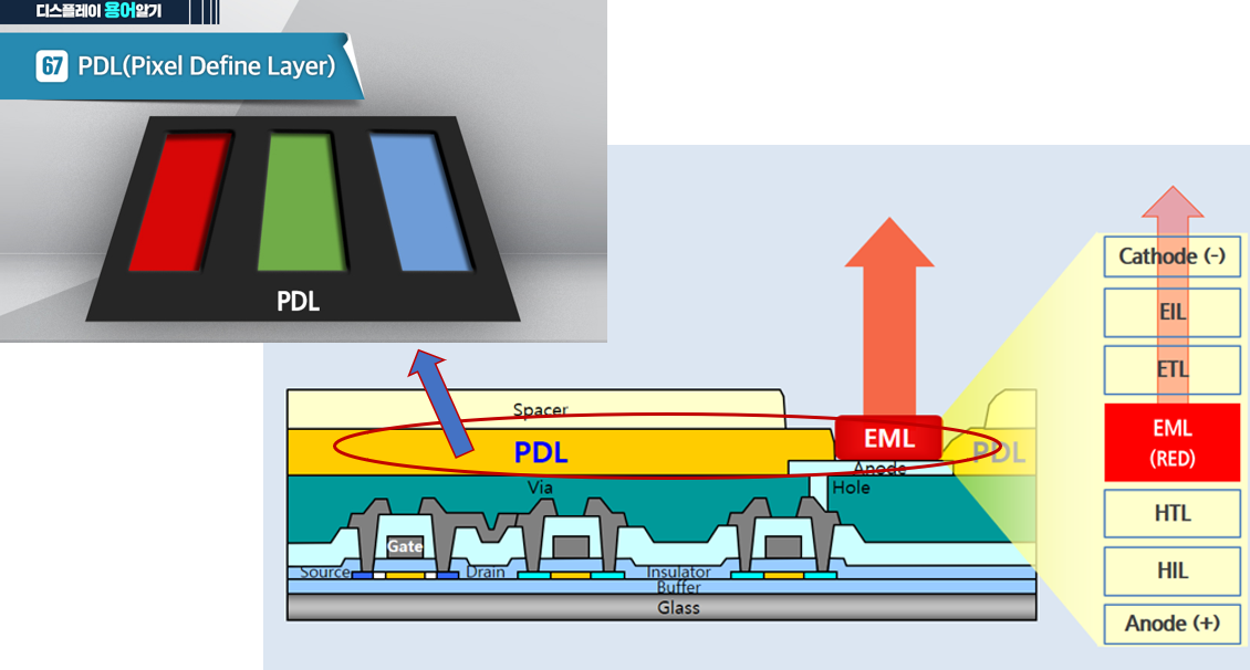 3) OLED 소자들마다 서로 간섭하지 않도록 구분해 주는 역할을 하는 층이 있음. 이를 PDL이라고 하는데, 이 PDL은 원래 투명했는데 이를 검은색 PDL로 교체하여 내부로 반사돼 돌아오는 빛들을 검은색 PDL에 의해 흡수가 됨