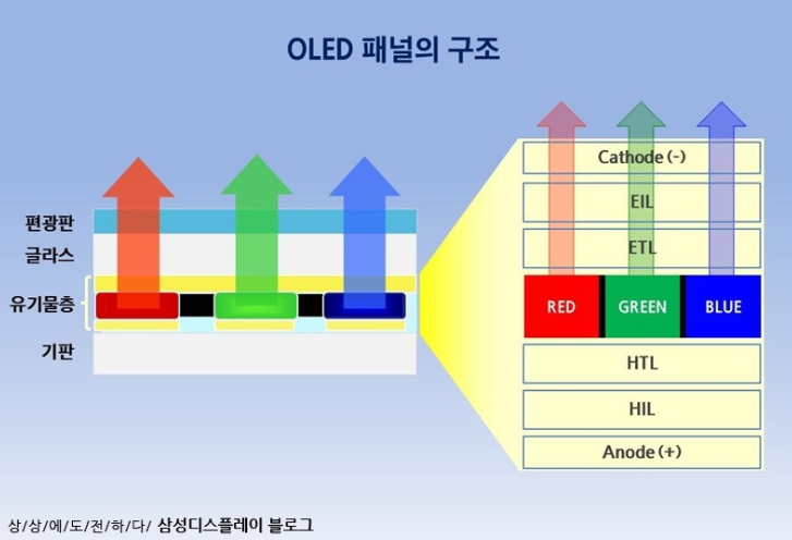 전통적인 OLED 패널의 구조는 아래와 같다. 유기물층이 OLED 발광소자가 들어있는 곳으로 이를 'EML(Emission Layer : 발광층)'이라고 한다. 여기서 발생한 빛이 편광판을 통해 밖으로 나가는 것이다.