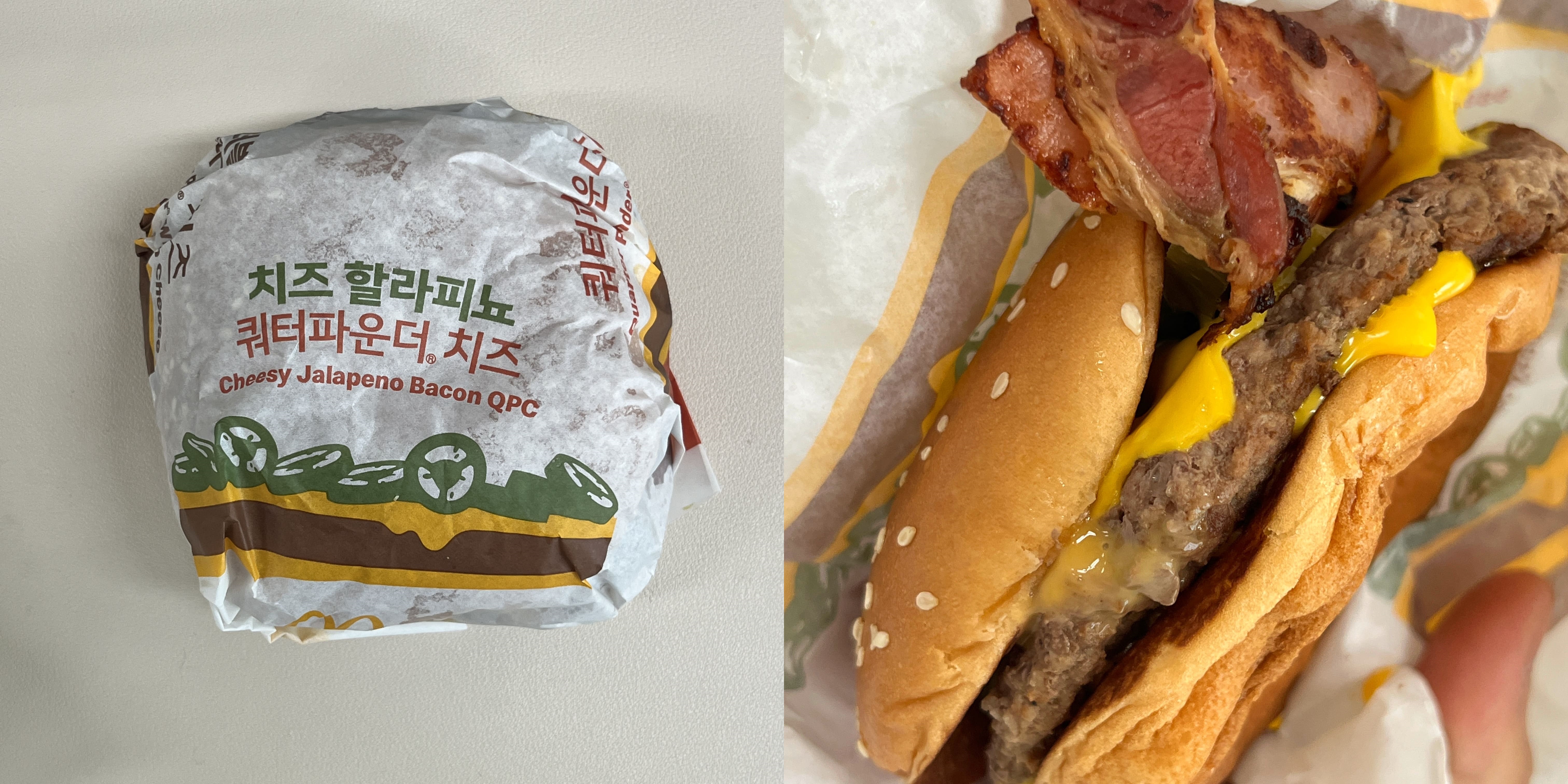 맥도날드에서 비싼 버거에 속하고 비프패티가 고퀄인 편에 속하는 쿼터파운드 치즈. 계속 먹으면 다소 느끼할 수 있는 부분을 할라피뇨가 잡아주는 역할을 한다.