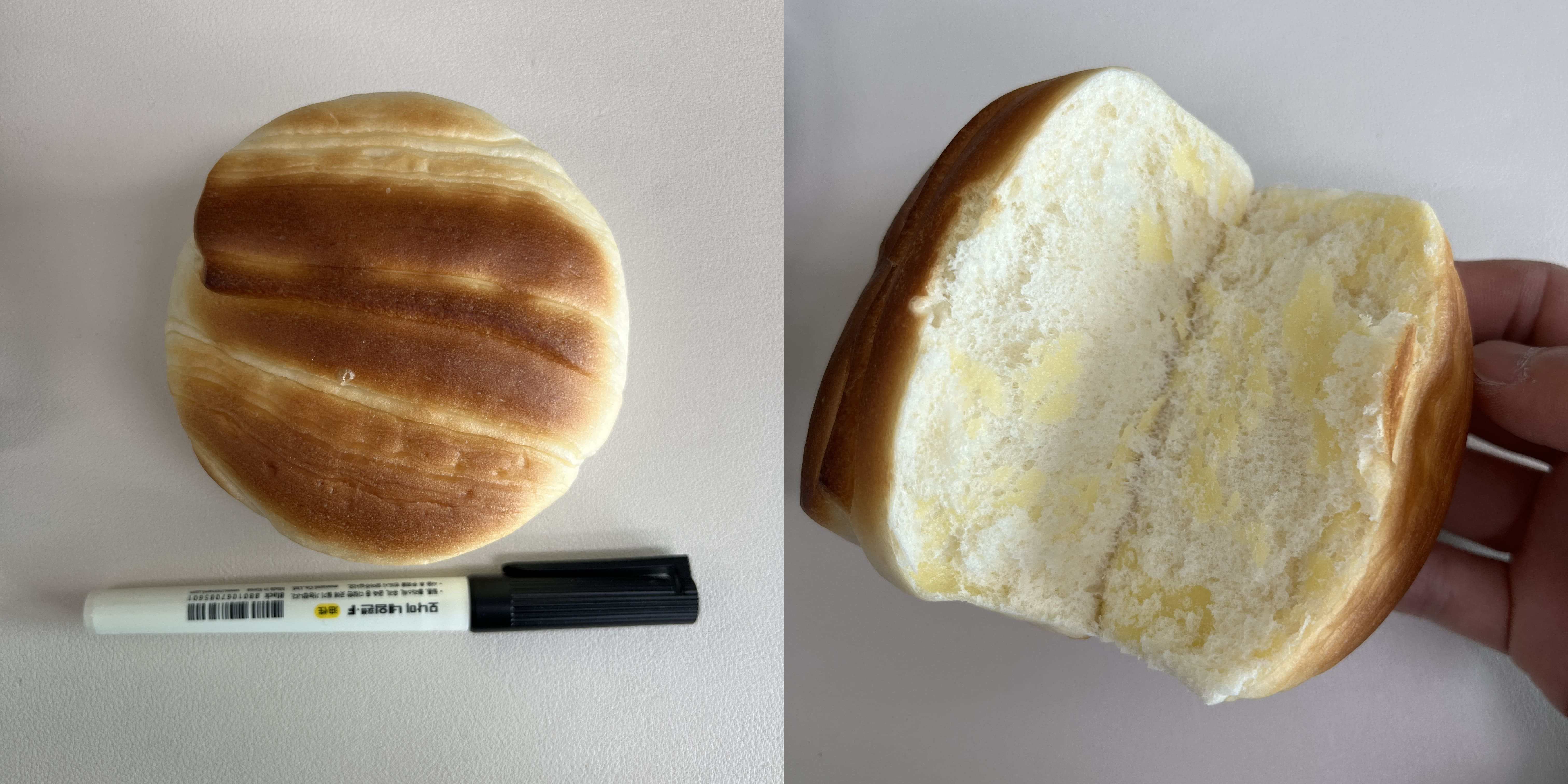 지름은 네임펜 절반만 하다. 저 빵 결마다 찢으면 진짜 잘 찢어진다. 안에 유독 노란 것은 버터인지 슈크림인지 모르겠다. 빵은 정말 부드럽게 잘 찢어지고 식감이 좋았다. 흘리지도 않고 좋다.