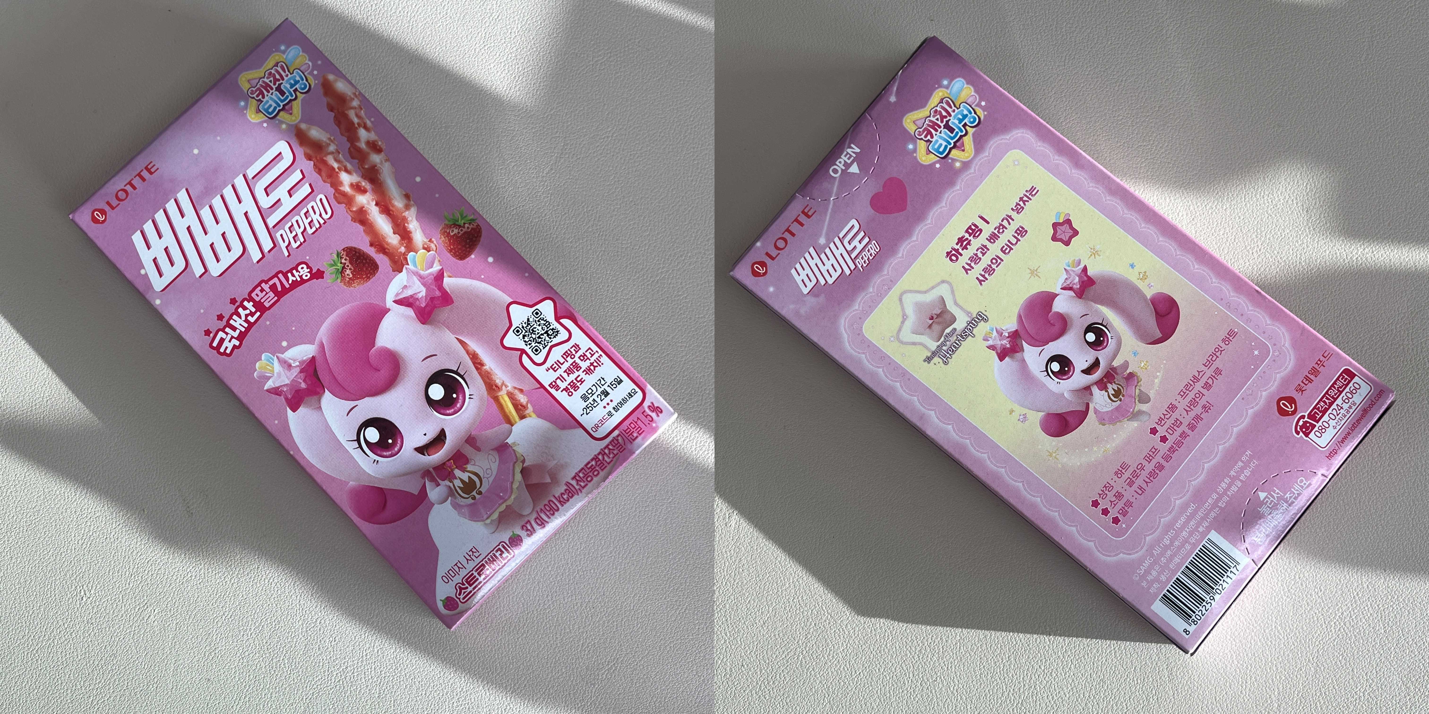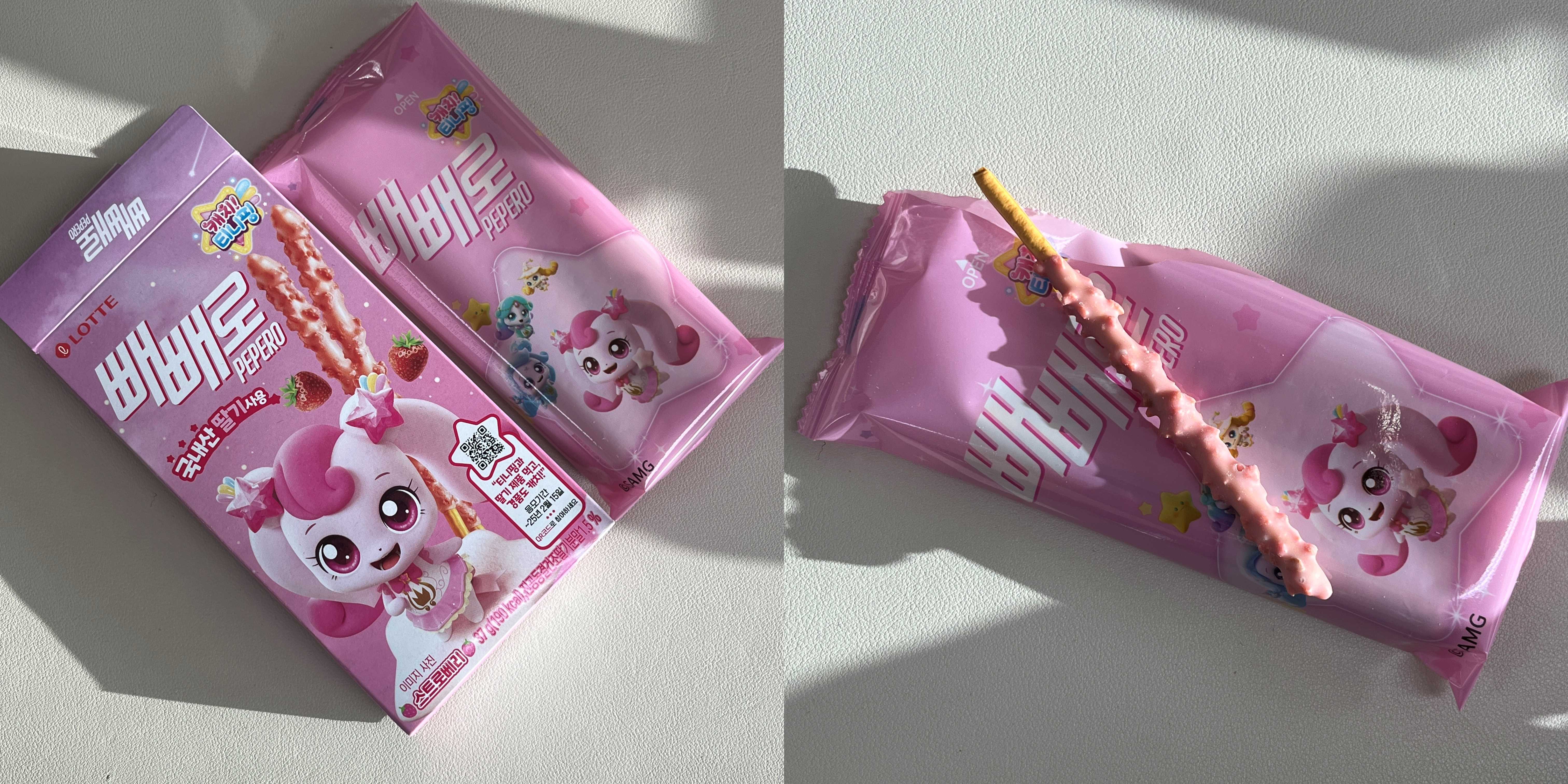 박스를 뜯고 내부 포장지도 하츄핑이 있다. 별거 아닐 수도 있지만 패키징 신경을 많이 쓰고 통일한 것 같아 보기가 좋다. 빼빼로 색깔은 연한 핑크고 맛도 아몬드 빼빼로 딸기 버전 같다. 진공 동결된 건조 딸기분말이 1.5% 들어가 있다고 하는데 특별하진 않았지만 꽤나 상큼하고 괜찮았다. 하지만 빼빼로가 9개밖에 안 들어서 양이 적다는 아쉬움이 크다.