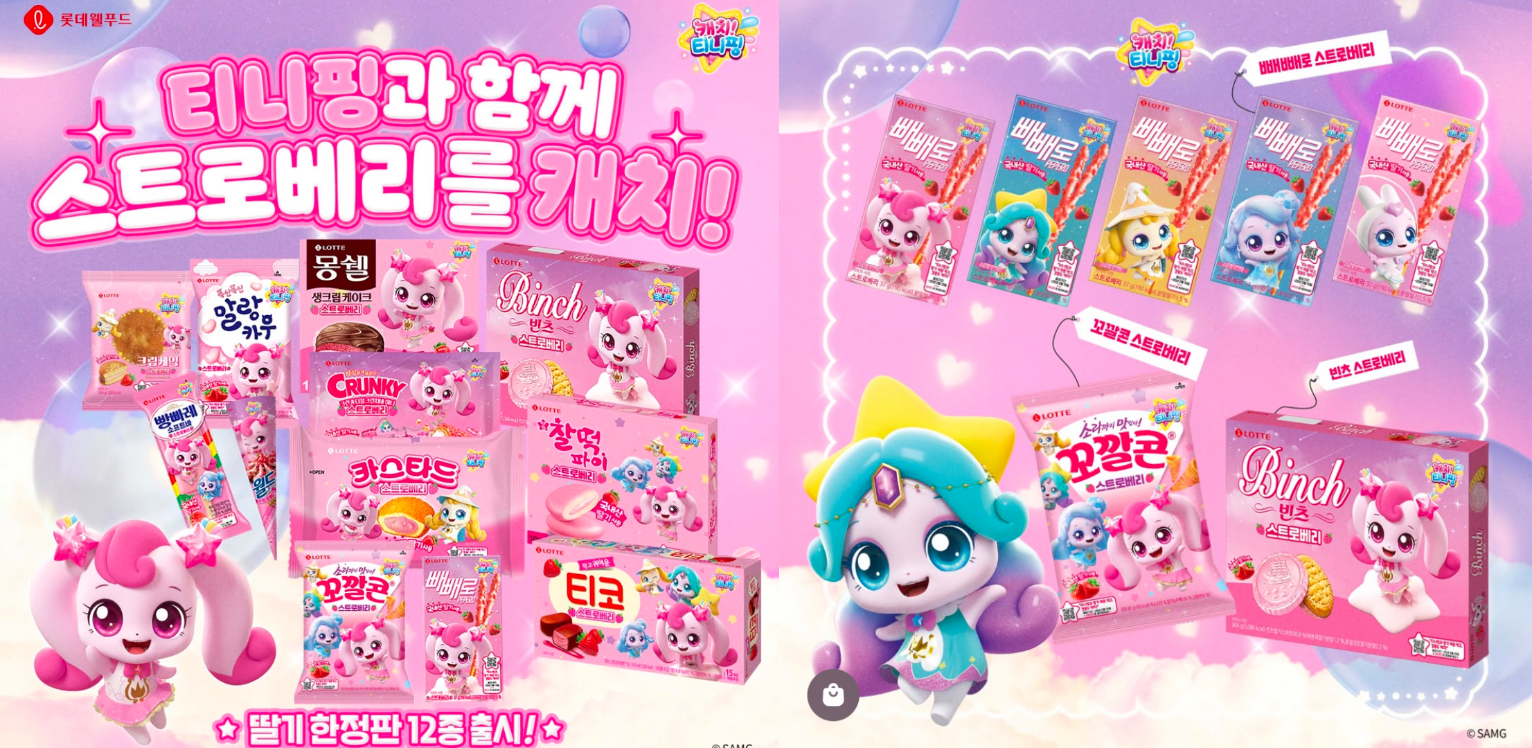 롯데웰푸드에서 겨울철 딸기 시즌을 맞아 25년 1월 7일부터 딸기 한정판 과자들을 출시했다. 이번엔 딸기 색깔에 맞게 핑크핑크한 디자인이다. 특히 캐치 티니핑과 협업을 해서 나왔는데 딸기 한정판 12종이 모두 티니핑으로 패키징 됐다. 맛은 모두 딸기맛이다.