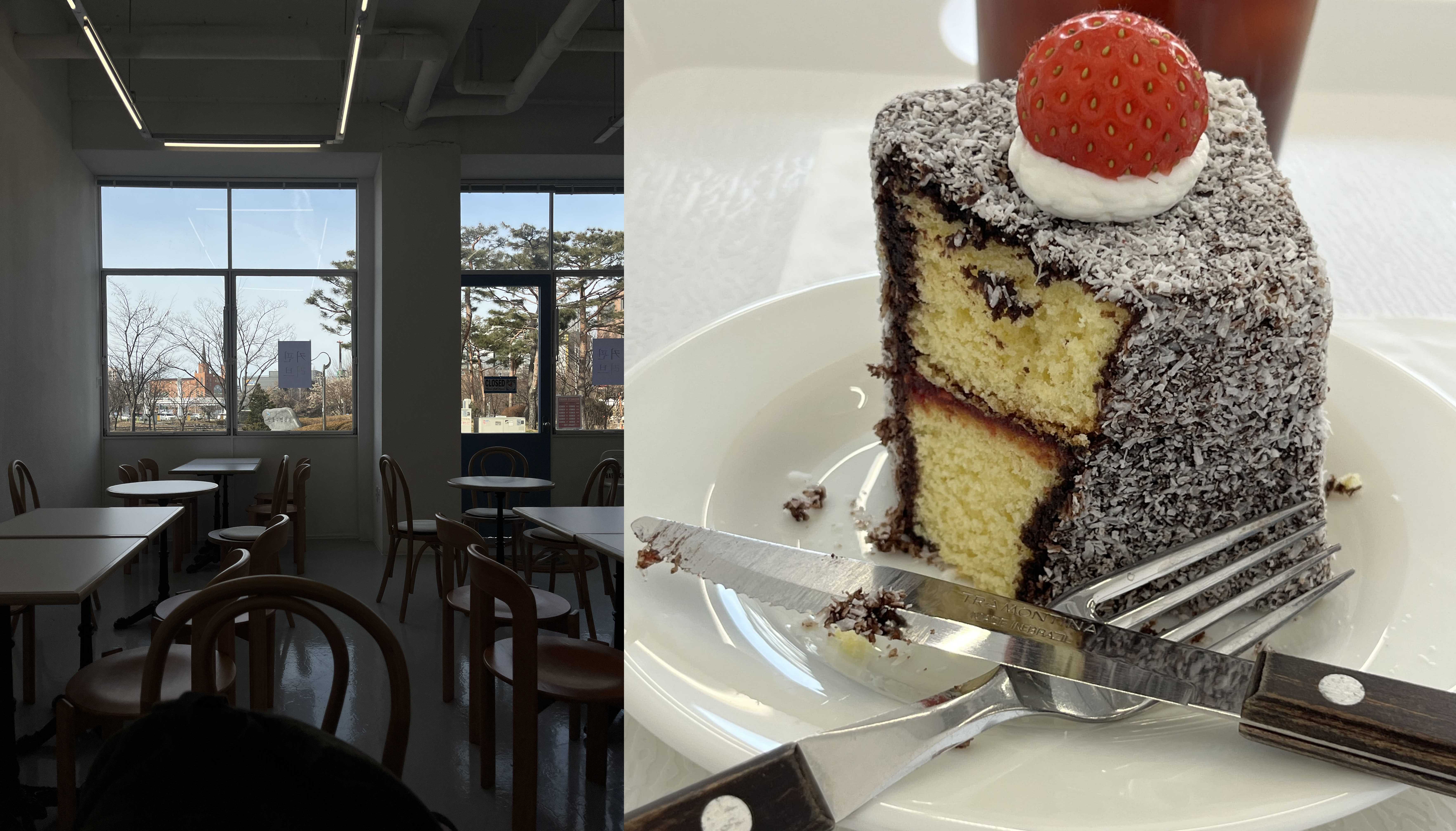 나는 아이스 아메리카노(4,500원)와 래밍턴 케이크(7,500원)를 시켰다. 아메리카노는 산미가 있는 화사함을 골랐다. 래밍턴 케이크는 라즈베리잼이 들어있고 위에는 딸기가 하나 올라간다. 크기는 큰 편이 아니다. 정사각형 모양인데 한 변의 길이당 검지 혹은 중지 손가락 길이정도 된다.