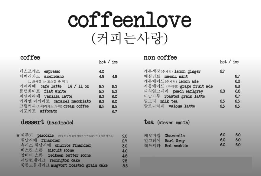 커피부터 논커피, 티 종류를 팔고 있으며 디저트는 피주키, 휘낭시에, 스콘, 래밍턴 케이크와 쑥콩고물 케이크 등을 판매하고 있다. *피주키는 피자와 쿠키의 합성어로 피자 모양처럼 널찍한 쿠키를 의미한다. 여기에 아이스크림을 올려준다. 래밍턴 케이크는 호주식 케이크로 스펀지케이크에 초콜릿을 묻히고 겉에는 코코넛 가루를 묻혔다. 커핀러브 래밍턴 케이크는 안에 라즈베리 잼이 추가됐다.