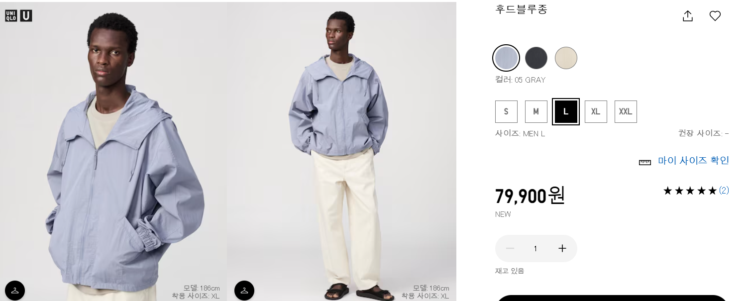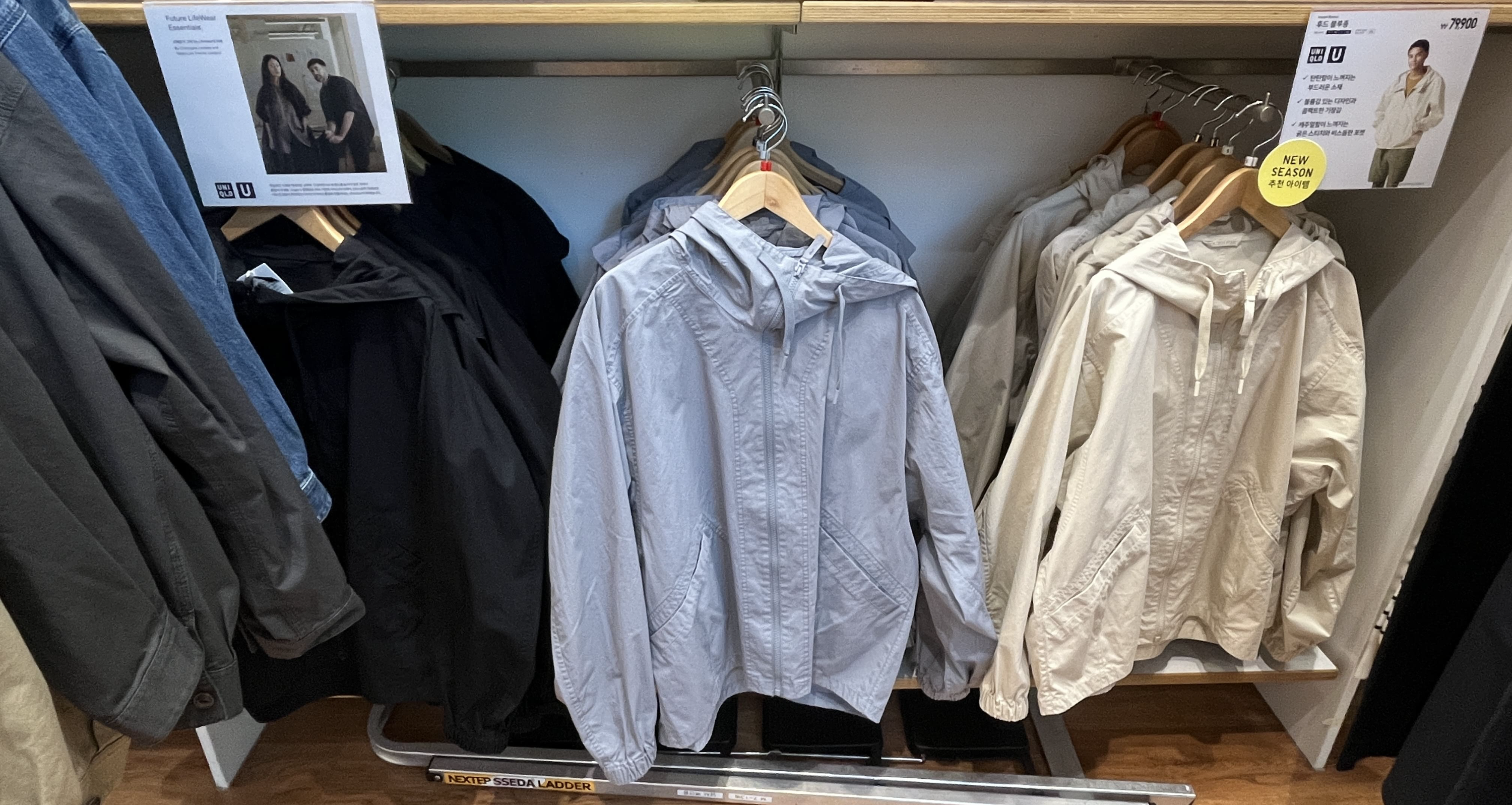 유니클로 U 25SS 선발매 제품 후드 블루종은 궁금해서 매장 가서 실착 해봤다. 그레이라고 말하지만 소라색을 띄고 있는 가운데가 메인 컬러인 듯