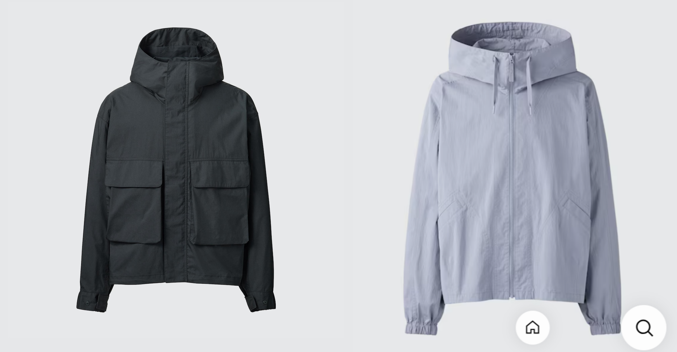 작년 유니클로 U 24SS 시즌에도 '유틸리티후드재킷'이라는 이름으로 동일한 나일론 소재의 후드 바람막이가 나왔었다. 아래 왼쪽 검은색이 24SS, 오른쪽이 25SS 시즌인데 하이넥 부분이 좀 더 폼이 커졌고 조절이 가능한 줄이 생겼다.