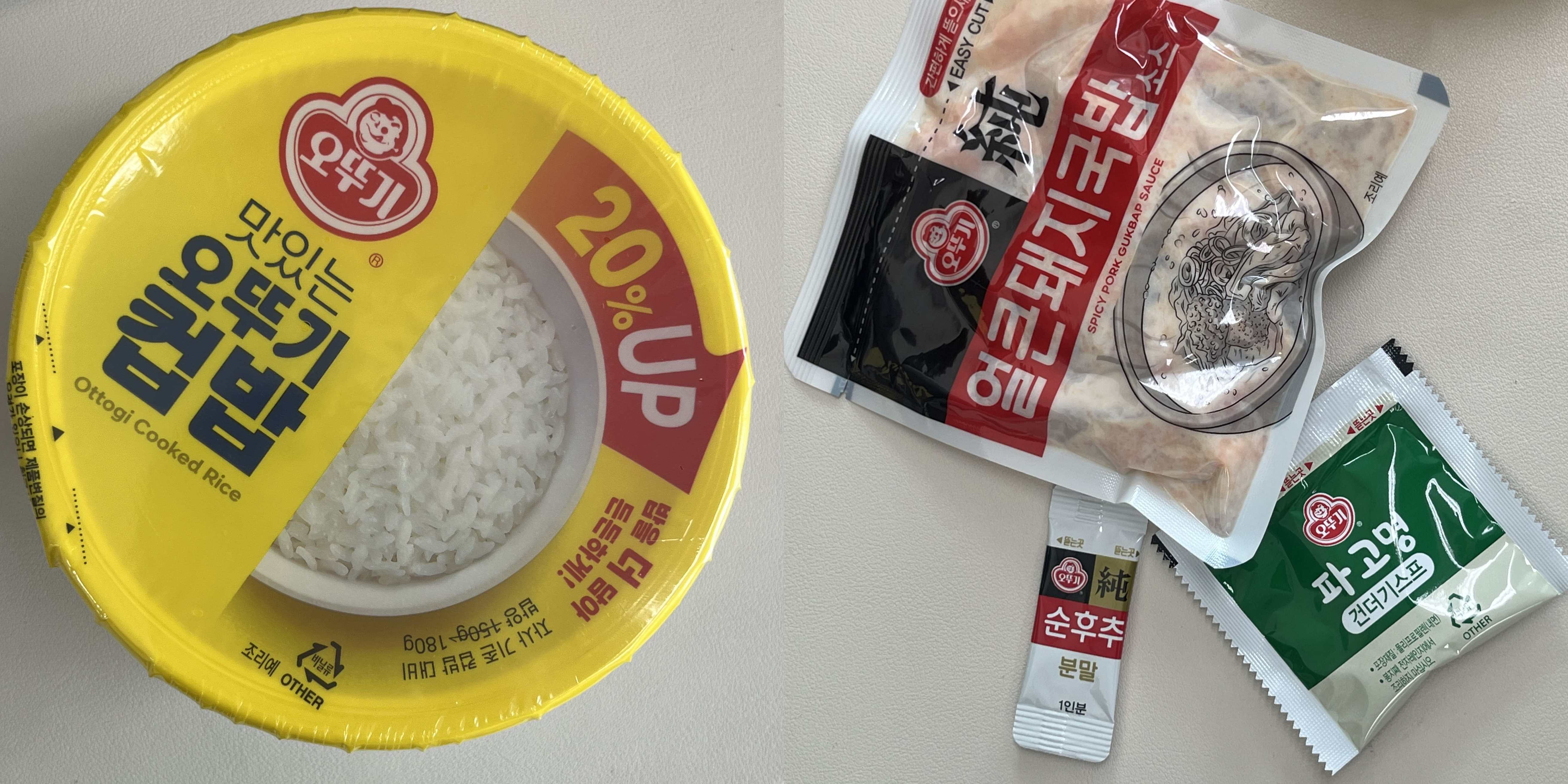 포장을 뜯으면 윗면엔 오뚜기 밥이 있고, 아래엔 얼큰돼지국밥소스와 파고명, 순후추가 있다. 돼지고기랑 파고명과 흑후추는 외국산이었다. 그리고 일회용 숟가락도 하나 들어있다.