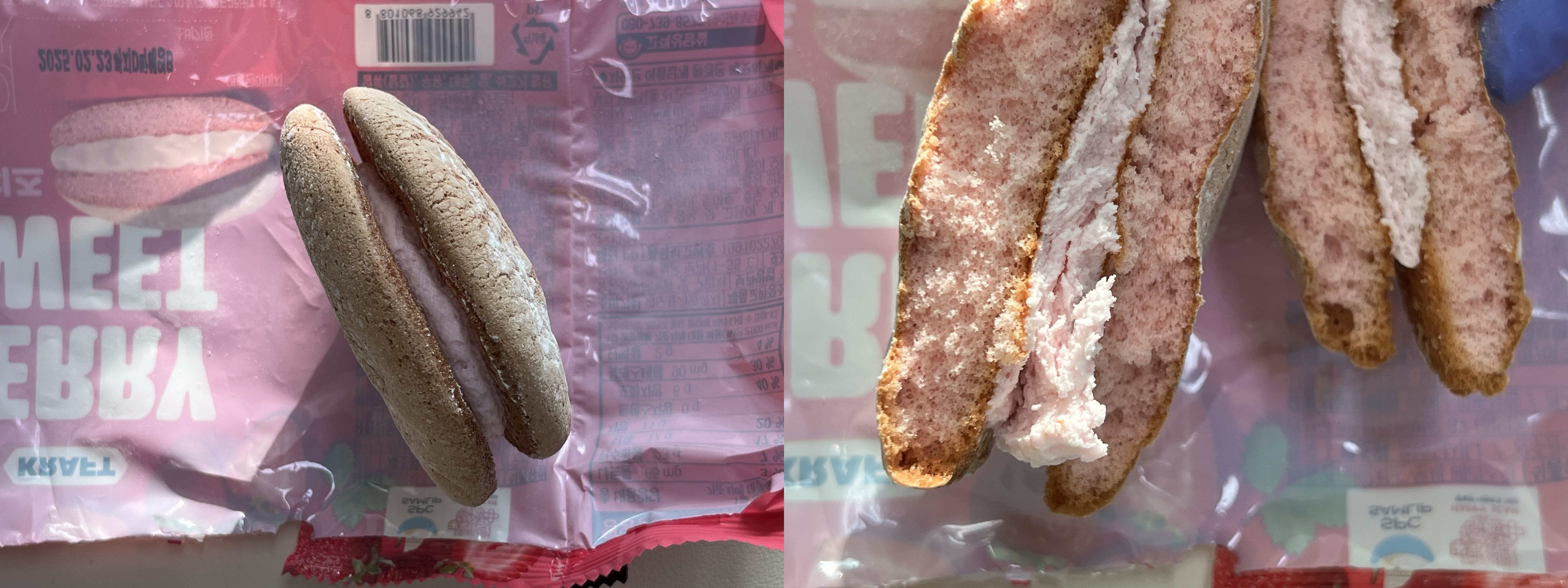단면은 이렇게 생겼고, 반을 나눠보니 안에 딸기맛이 나는 크림치즈가 들어있다. 빵도 딸기맛이 은은하게 난다. 먹어보니 좀 더 밀도가 있지만 부드러운 크림치즈맛이 나는 후레쉬베리 느낌이다. 딱 진짜 간단한 디저트로 적당한 크기와 맛이었다.