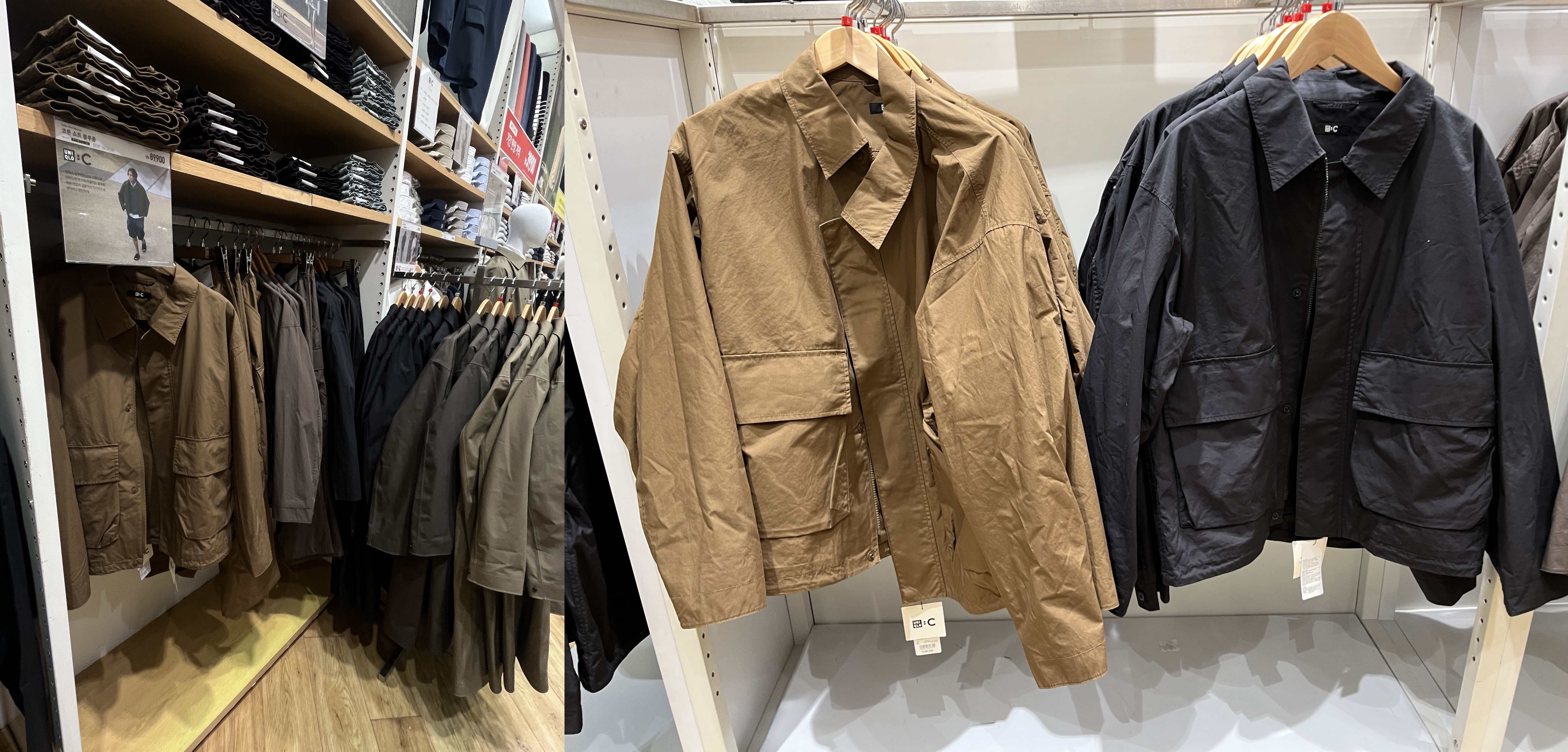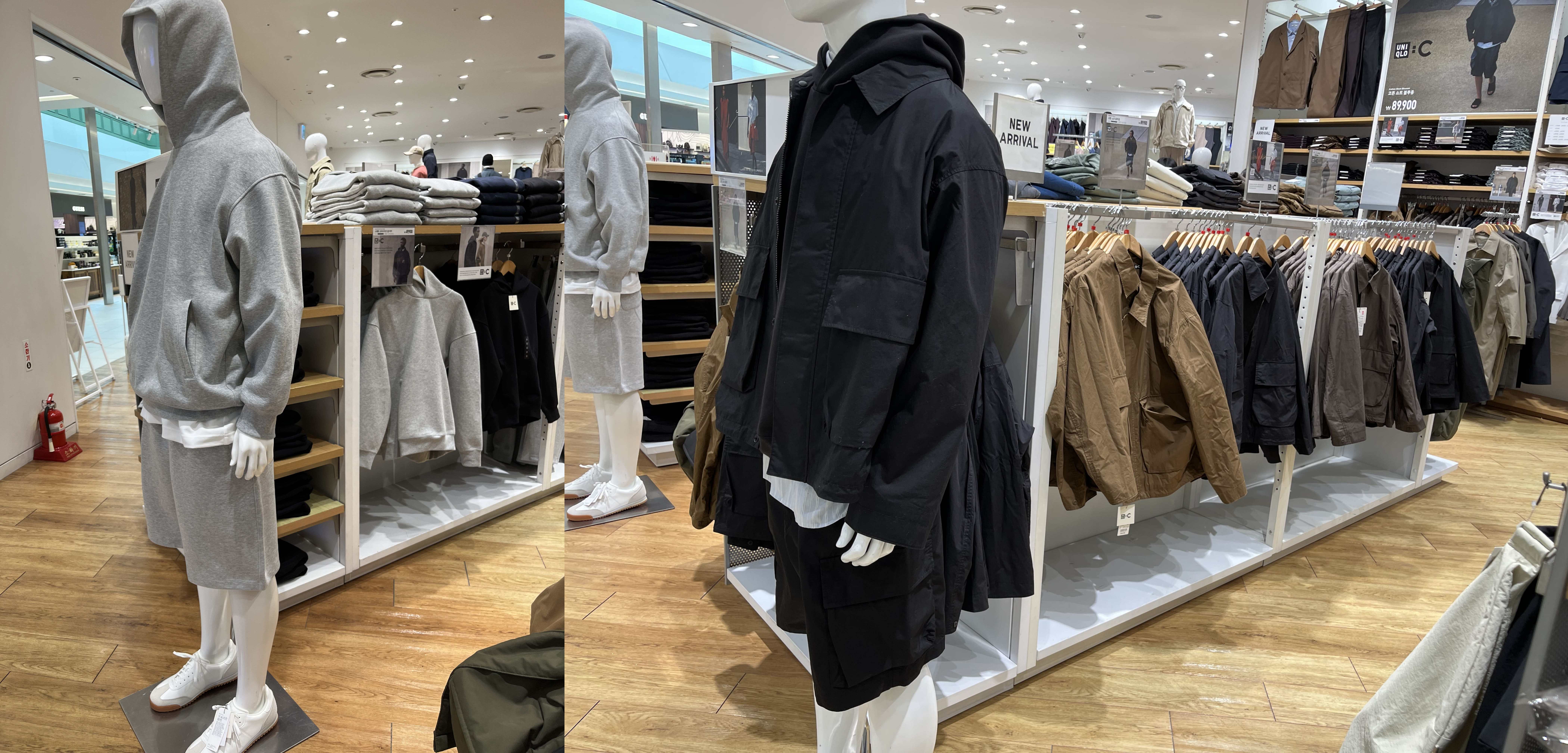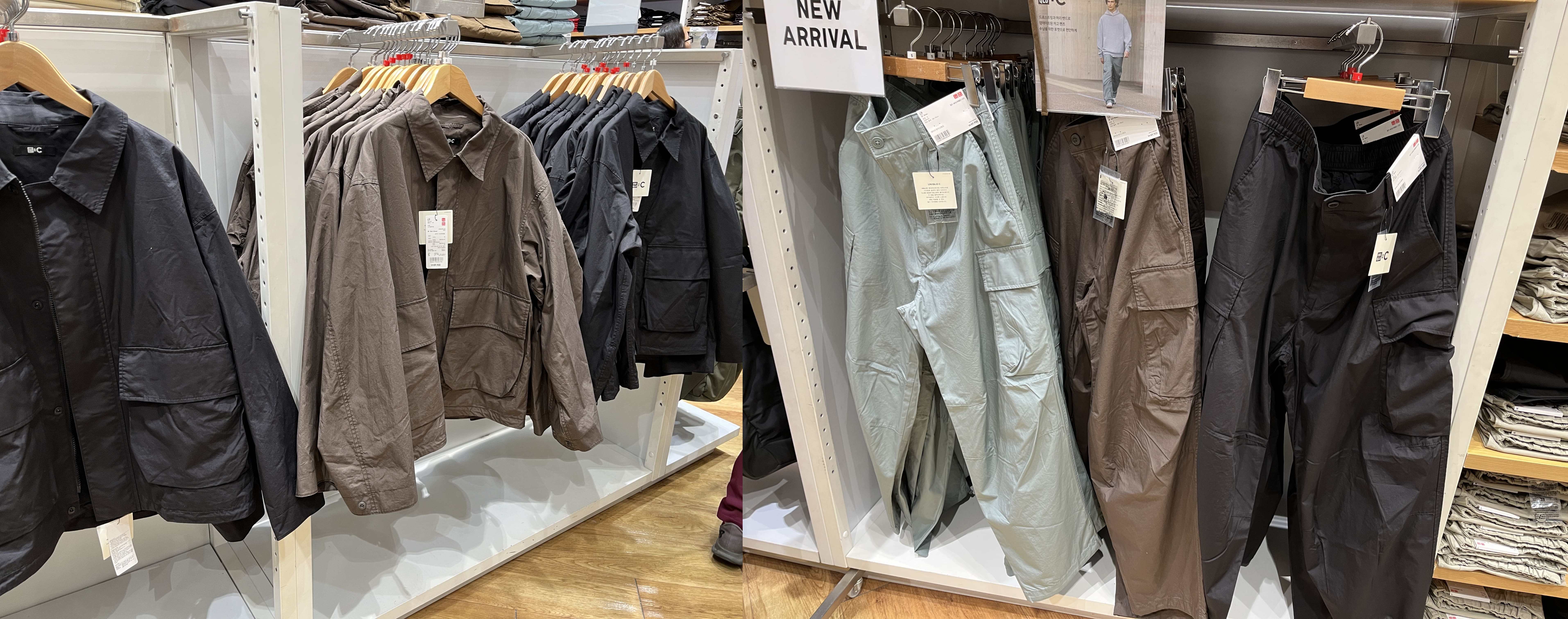 유니클로 타임빌라스 수원점에 오후 12시쯤 방문했었다. 이번에 출시된 유니클로 C 25ss 전 제품이 다 입고가 됐었다. 1층엔 여성라인과 가방 및 신발, 2층엔 남성 라인과 신발이 있었다. 나는 워크재킷과 이지워크팬츠가 궁금했기 때문에 빠르게 2층 남성 라인만 둘러봤다.