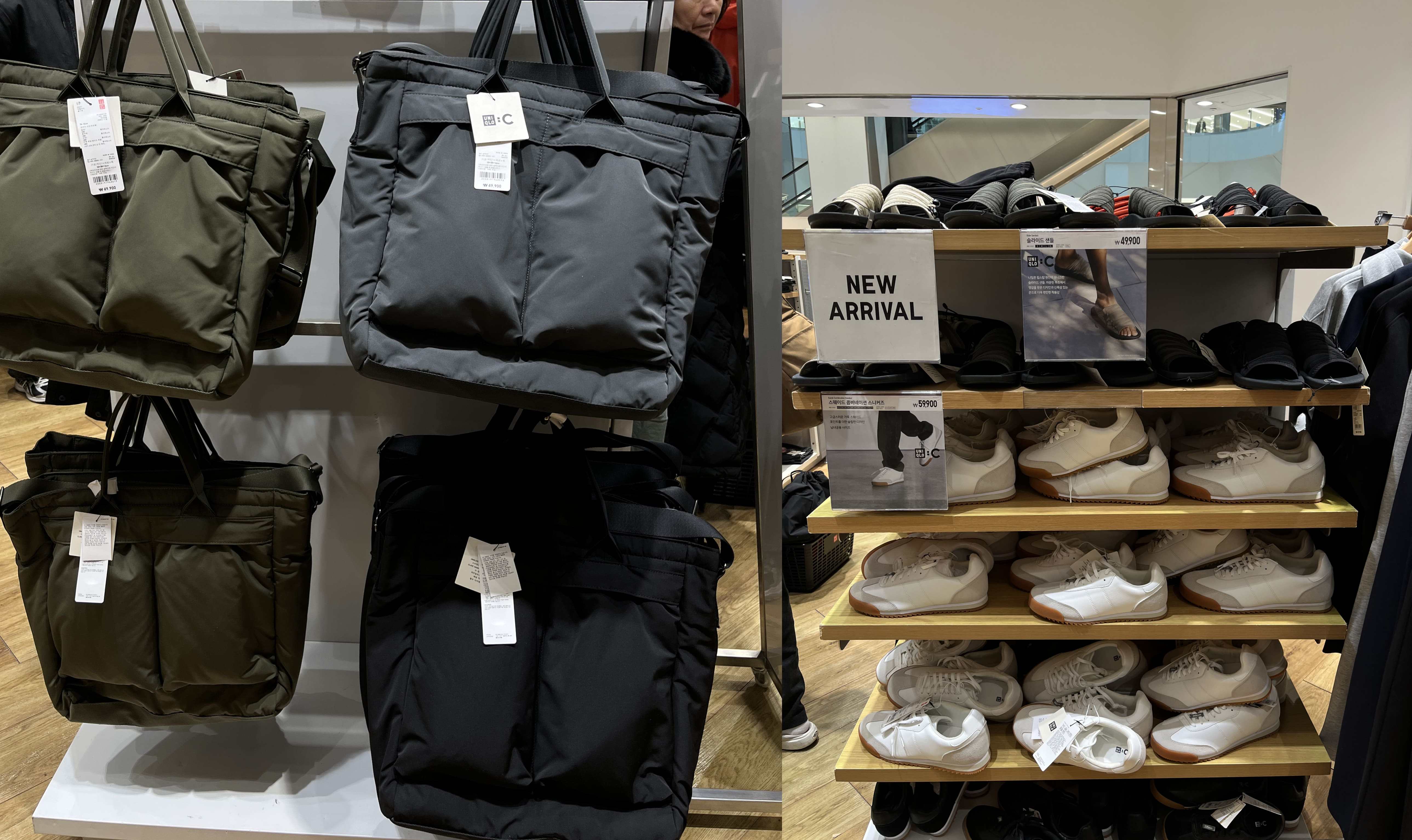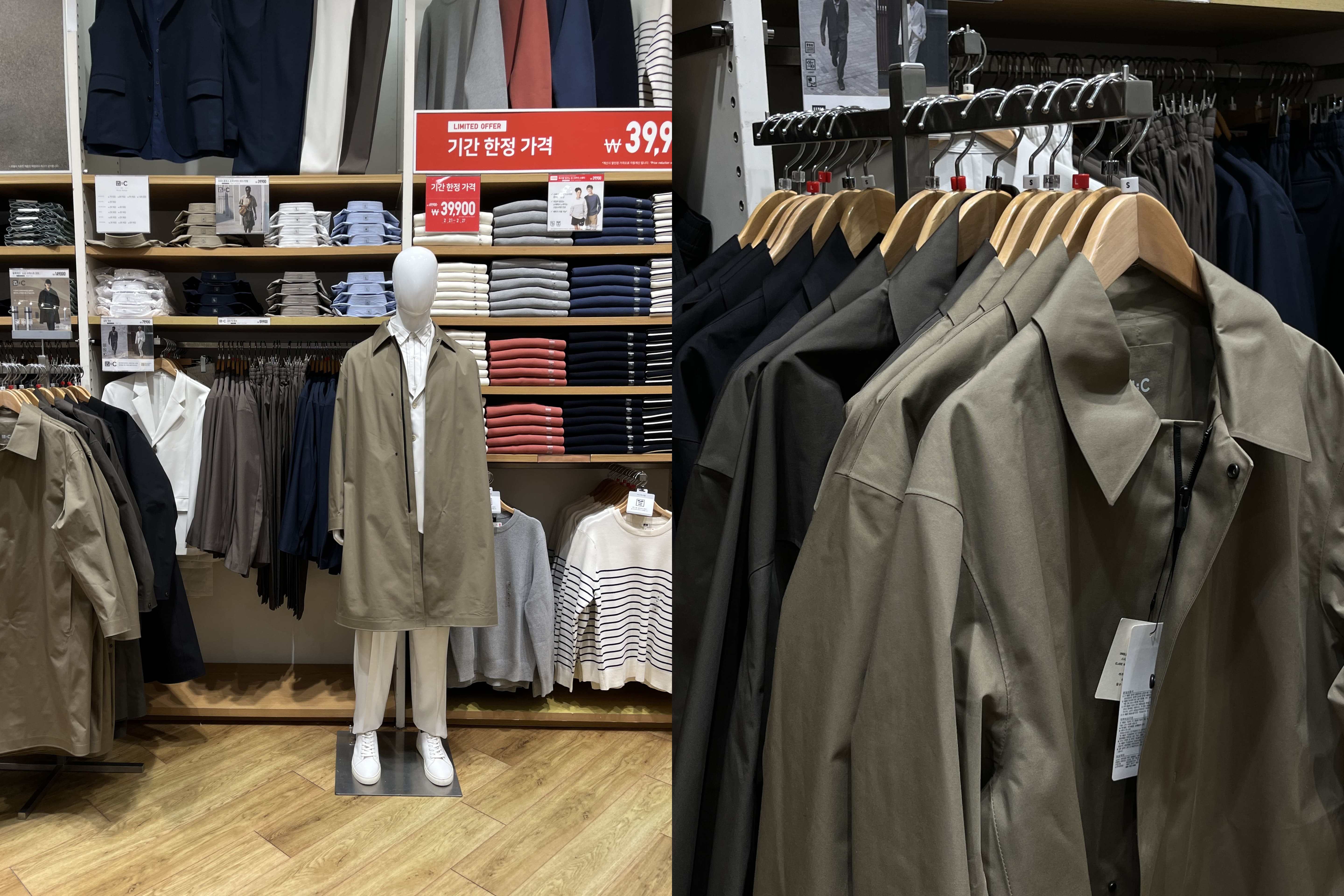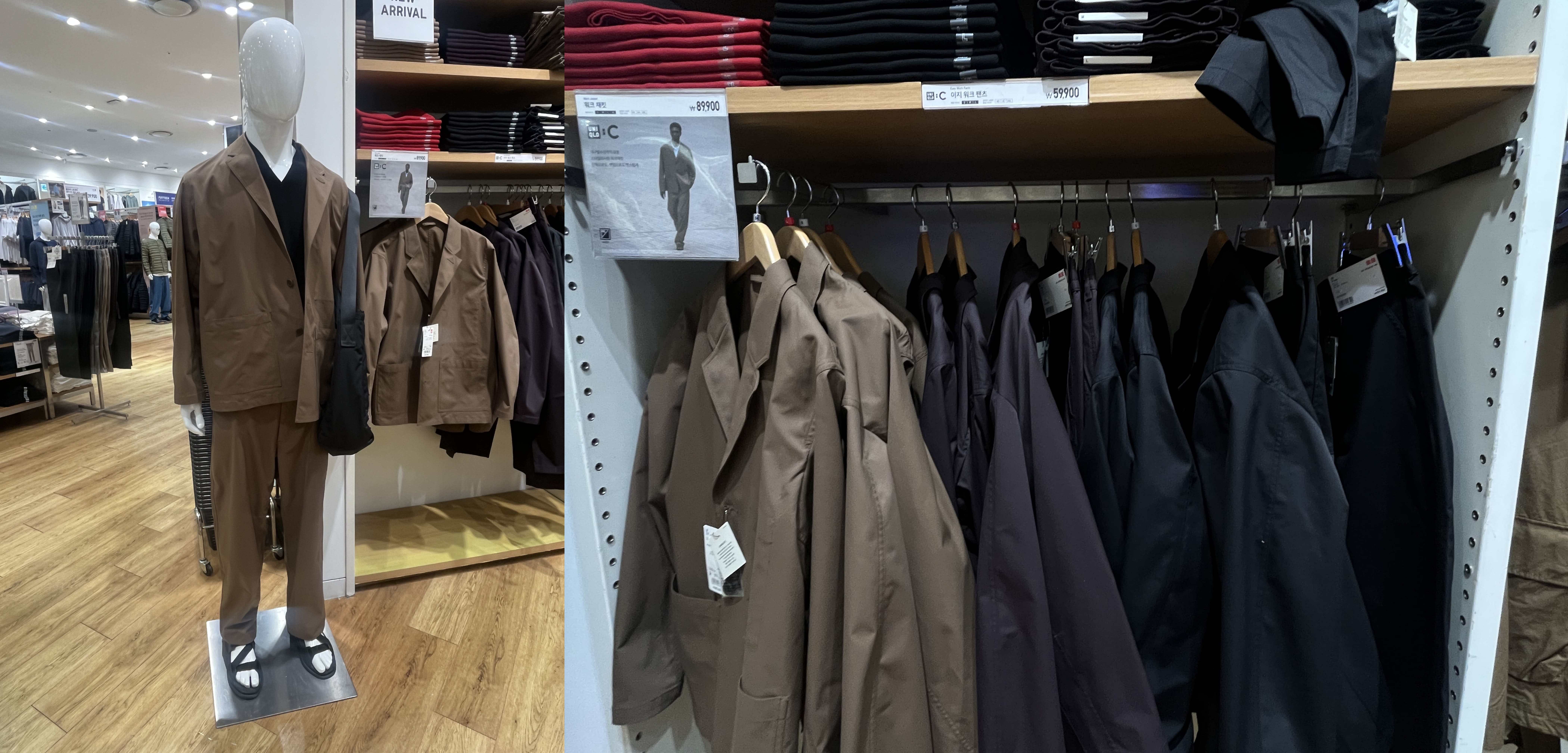 유니클로 타임빌라스 수원점에 오후 12시쯤 방문했었다. 이번에 출시된 유니클로 C 25ss 전 제품이 다 입고가 됐었다. 1층엔 여성라인과 가방 및 신발, 2층엔 남성 라인과 신발이 있었다. 나는 워크재킷과 이지워크팬츠가 궁금했기 때문에 빠르게 2층 남성 라인만 둘러봤다.