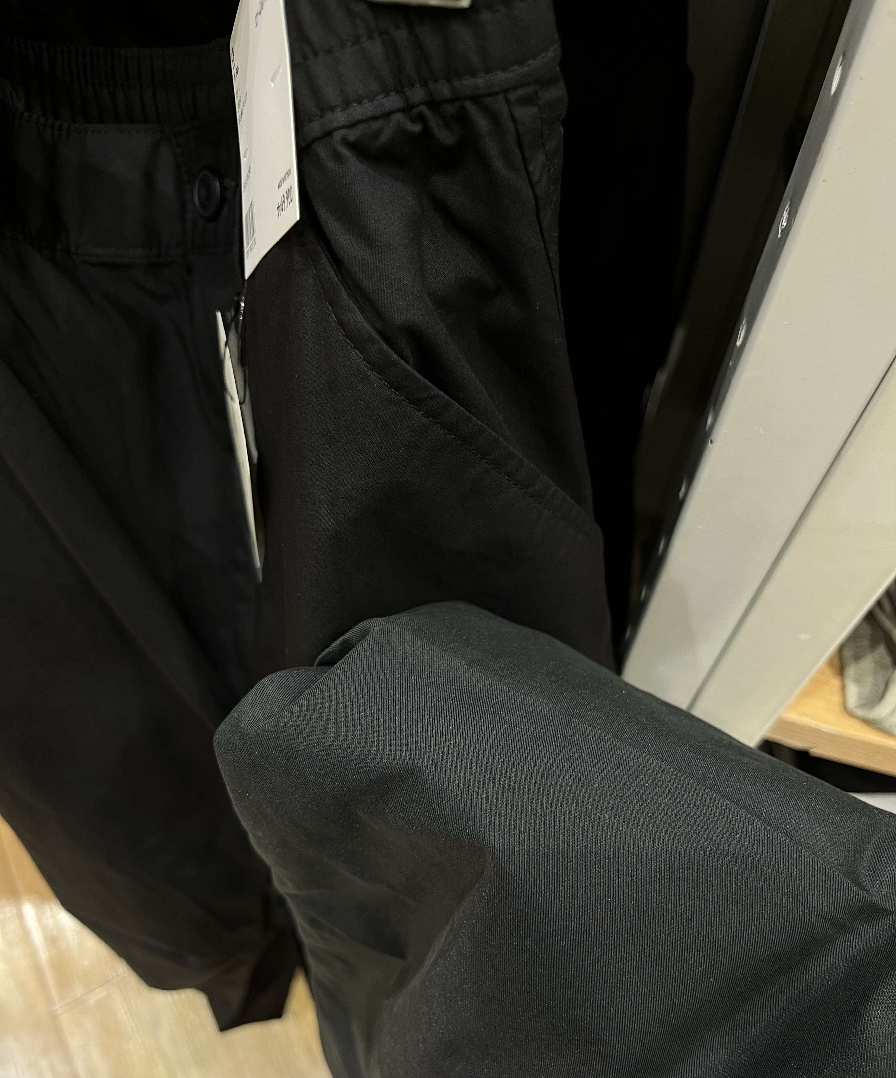 맨 오른쪽 사진은 와이드핏카고팬츠 블랙과 와이드파라슈트팬츠 블랙. 같은 블랙이지만 파라슈트는 나일론이 섞여서 그런지 차콜 느낌이 난다. 두 바지는 다 얇아서 여름에도 입고 다녀도 될 정도다. 당장 사도 입을 수 있는 날씨가 아니라서 두 개 다 위시리스트에 일단 담아두고 고민 중이다.