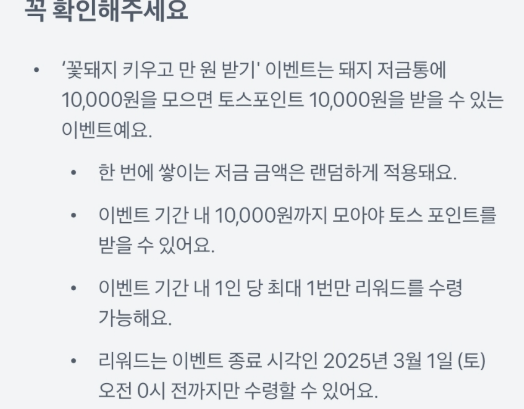 꽃돼지 키우고 만원 받기 이벤트로 돼지 저금통에 만 원을 모으면 토스포인트 만원을 받을 수 있는 이벤트이다. 이벤트 기간 내에 만원까지 모아야 토스 포인트를 받을 수 있다.