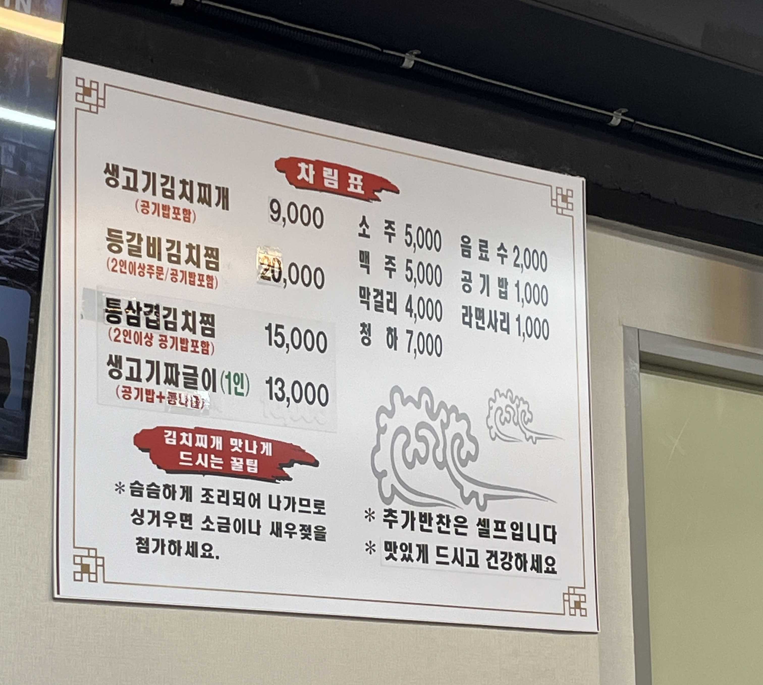 메뉴는 김치찌개와 등갈비김치찜, 통삼겹김치찜, 생고기짜글이다. 나머지는 주류 및 음료다. 뭔가 김치찌개, 김치찜만 있는 메뉴판이라 신뢰도 급상승. 믿음직스럽다. 게다가 맛있게 드시고 건강하라는 멘트까지 있다. 뭔가 배려심이 많은 느낌.