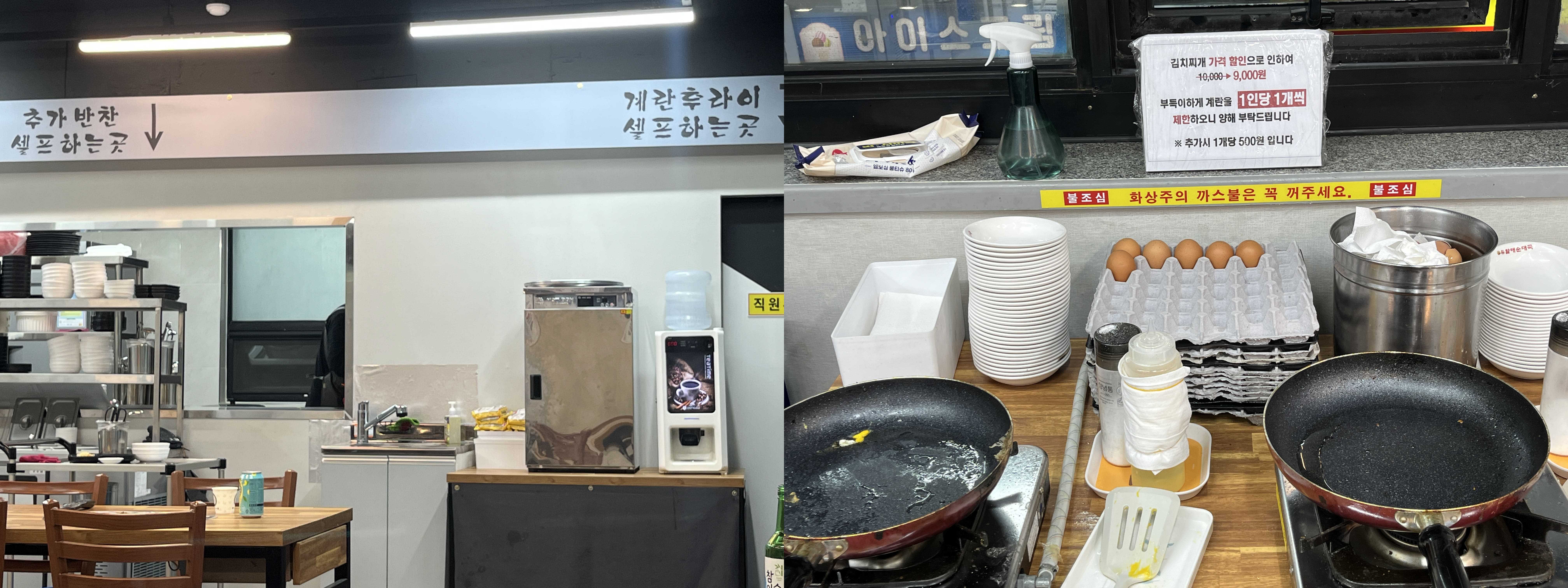 기본 반찬이 나오고 추가 반찬 셀프하는 곳의 안내돼 있다. 그리고 1인당 1개씩 계란후라이 먹을 수 있다. 셀프로 계란후라이 해서 가져가면 된다. 요즘 계란도 비싸서 추가 금액 내는 곳도 많아서 보기 드문 곳.