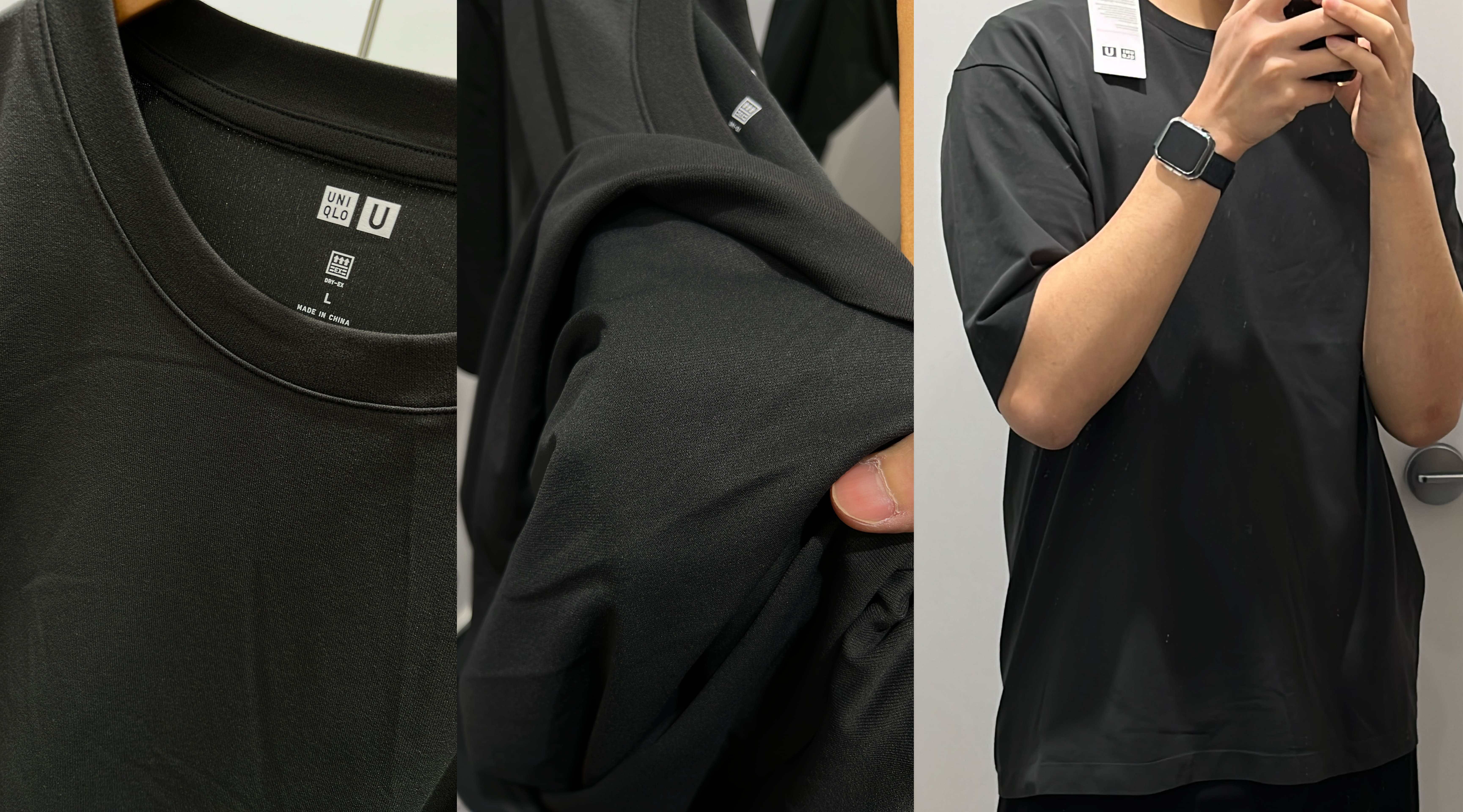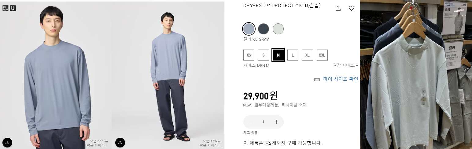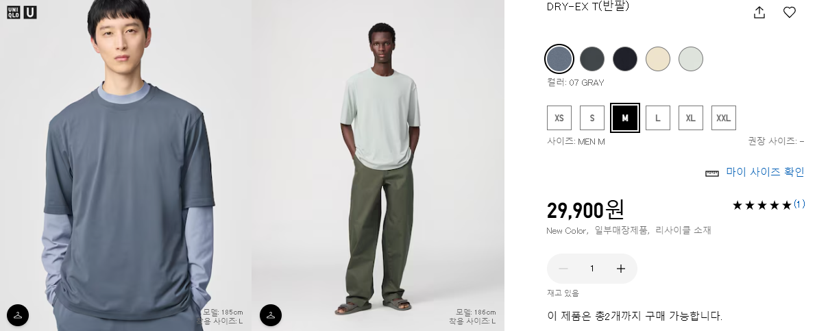 일부 매장 제품이다. 5가지 색상이고 기존 DRY 티셔츠와 다른 점은 그냥 에어리즘 코튼오버사이즈 크루넥 반팔티 같다. 기존의 DRY 티셔츠는 기능성이 들어갔다는 느낌이 강했는데 U라인은 그냥 평범한 반팔티 같다.