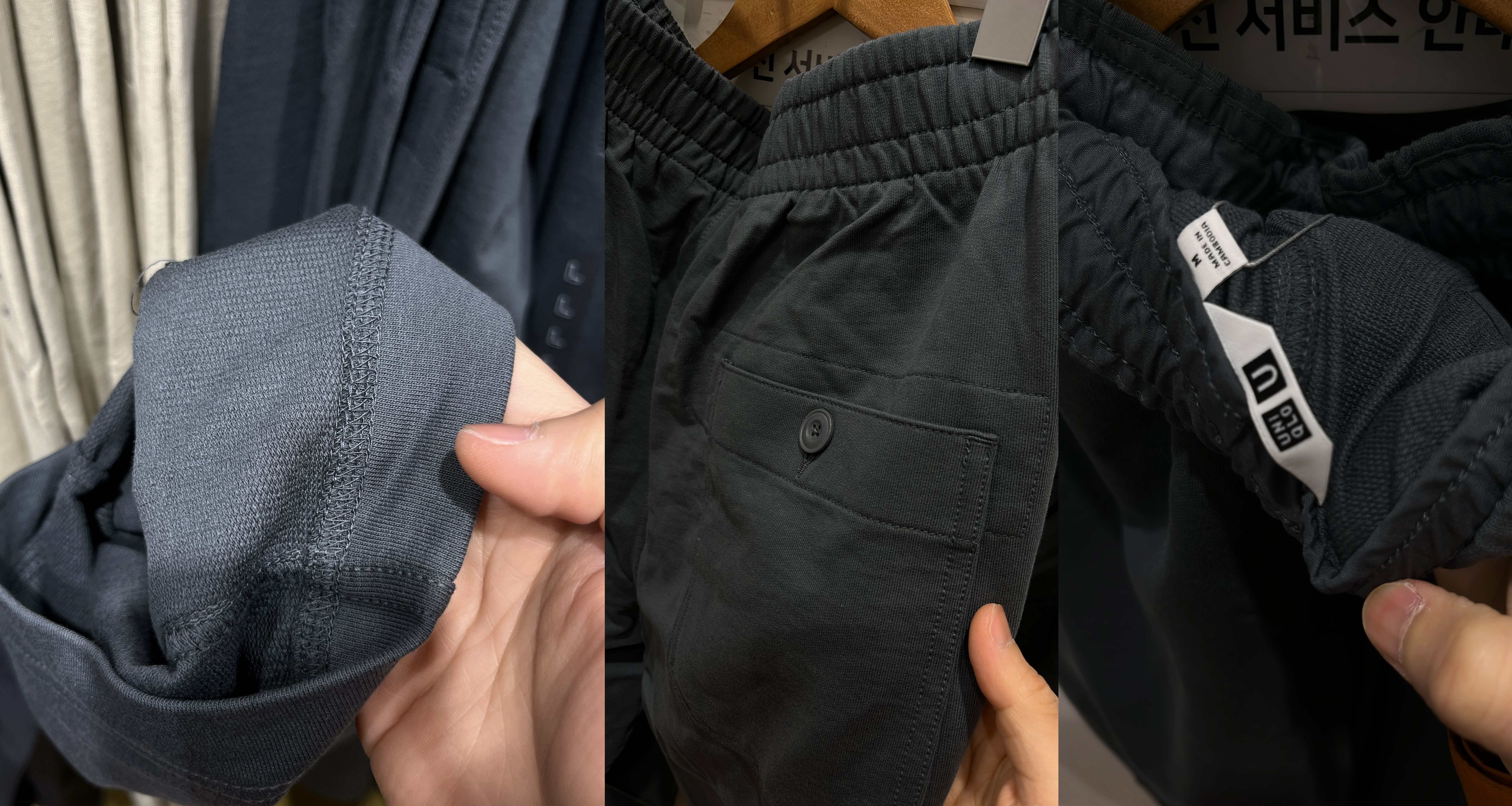 뒤에는 단추가 달린 주머니가 있으며, C라인 스웨트팬츠 처럼 밴딩 안쪽에 조일 수 있는 끈이 있다. 사이즈는 C 라인 스웨트 팬츠랑 흡사한데 살짝 크게 나온 느낌이었다. 그리고 오히려 카메라가 실물 사진을 못 담는데 유니클로 홈페이지에 나온 것과 똑같은 색상이다.