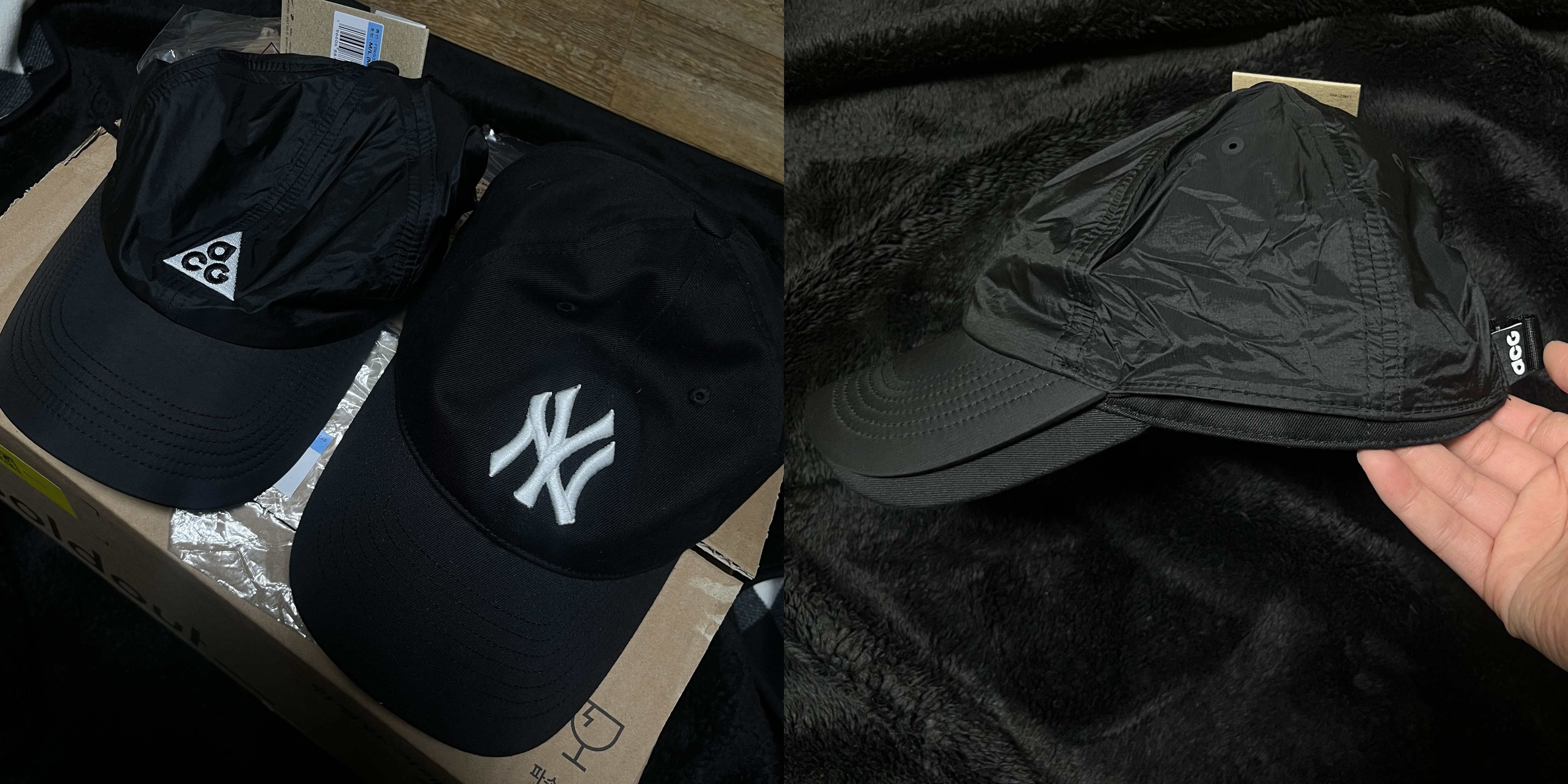 뒤에 버클 조절을 제대로 하지 않은 상품 받은 그대로에서 MLB 모자와 비교했을 크기다. 아래에 MLB 모자를 깔고 위에 ACG 트레일 캡을 얹어봤다. 두 크기가 거의 흡사함을 알 수 있다.