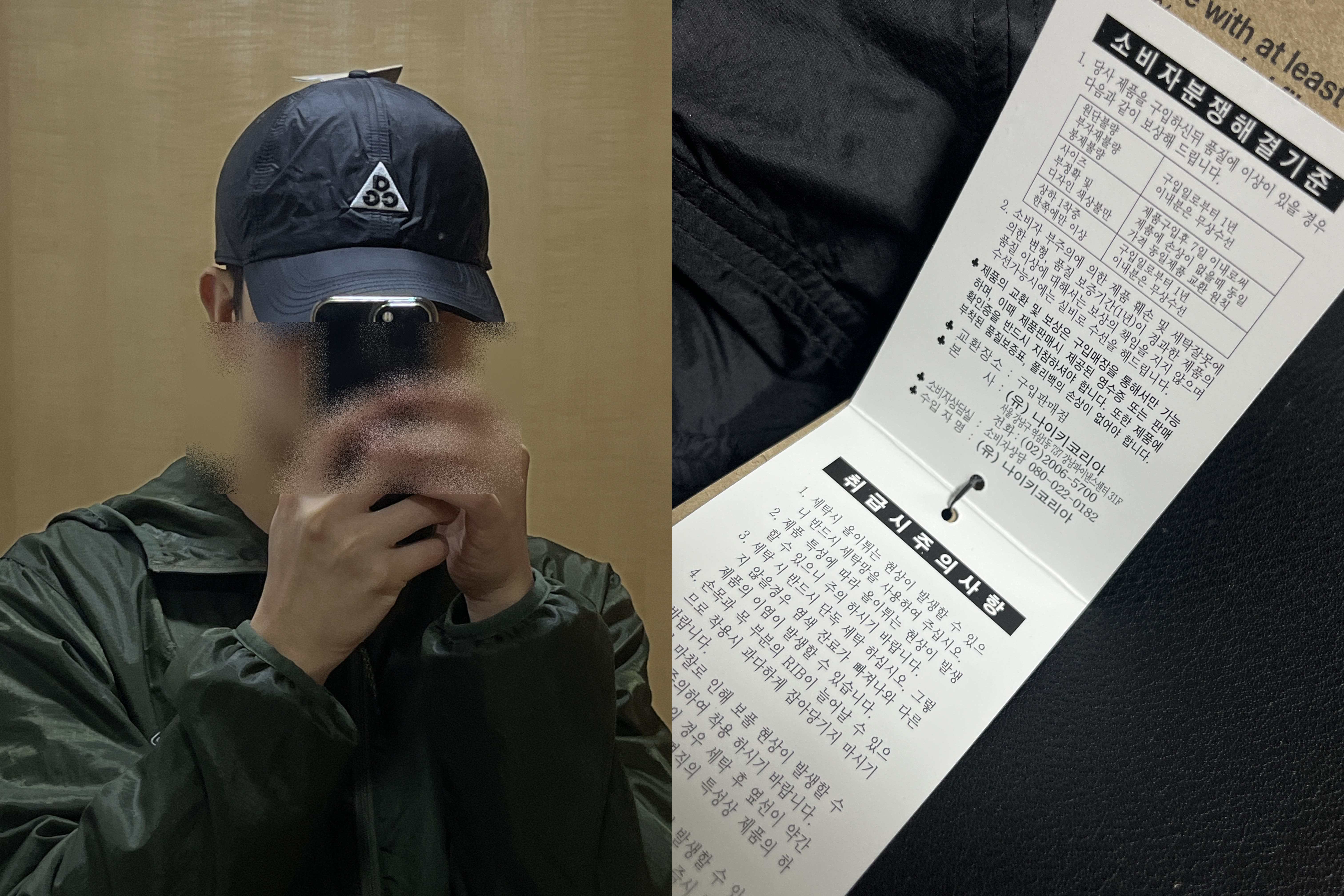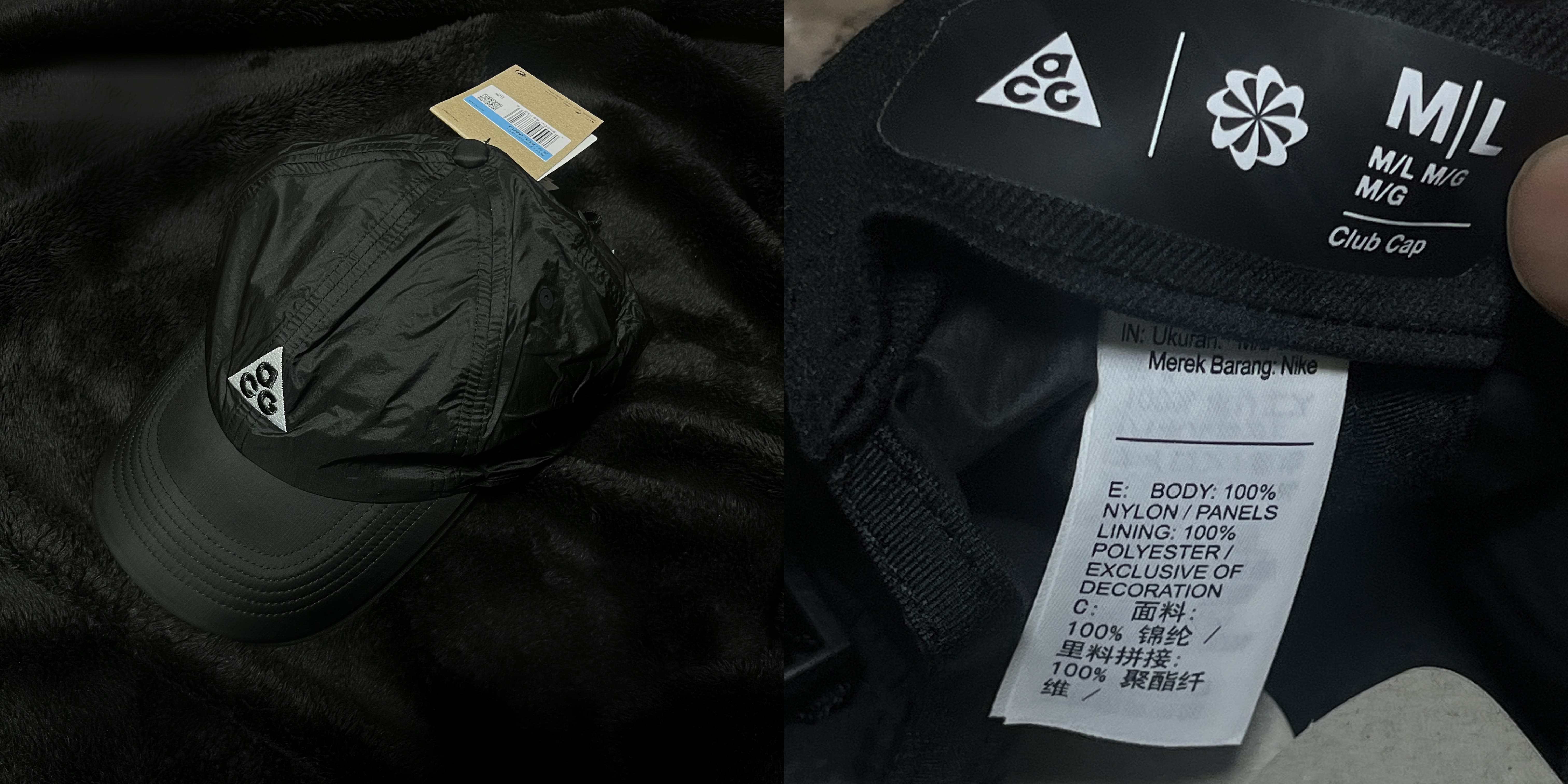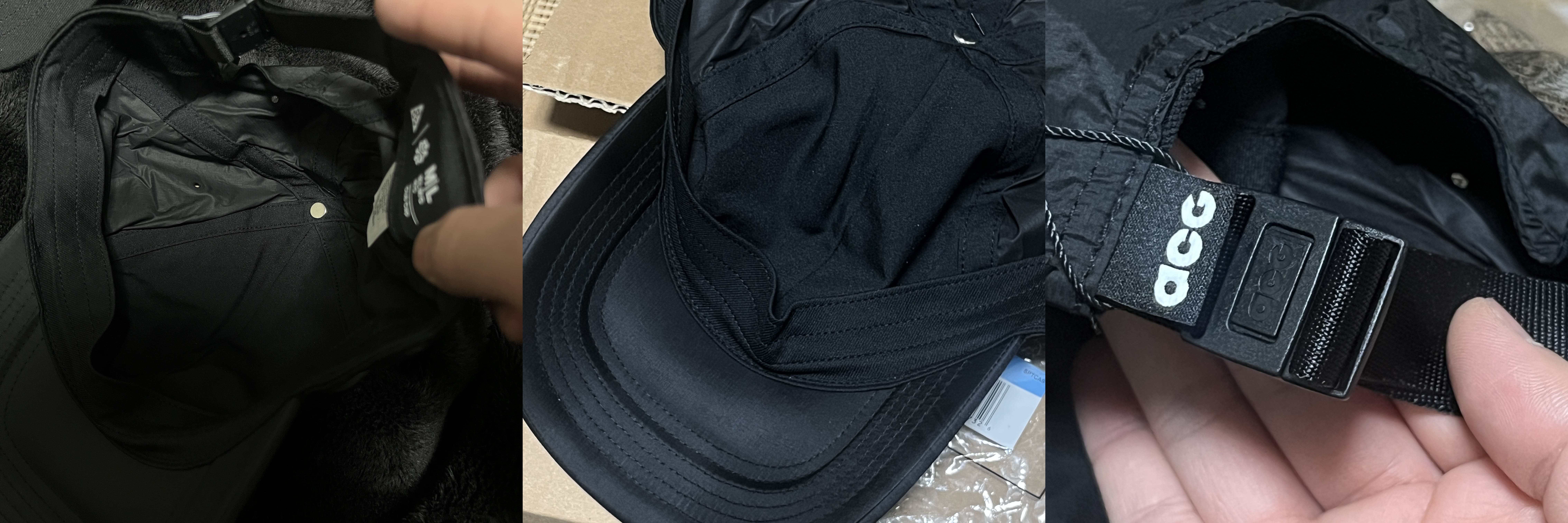 안감은 폴리에스터가 몸체는 나일론이다. 챙 바로 앞쪽에 ACG로고가 있는 안감만 살짝 소재가 다른 느낌이고 챙은 두꺼워 보이지만 가볍다.