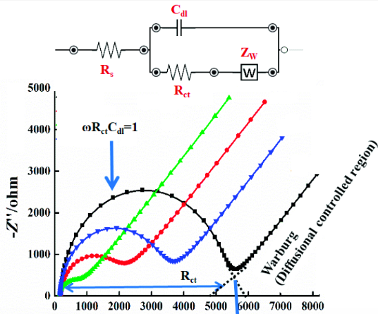 그리고 이 반원호의 크기를 'Rp'라고 한다. Rp는 보통 전하 이동 저항에 속한다. 45도로 직선으로 쭉 뻗어나가는 것은 'Warburg 계수 (Warburg coefficient)'를 의미한다. 이는 전해질 내부에서 확산될 때 생기는 지연 계수를 의미하며 클수록 확산이 더 느리다는 것을 의미한다.