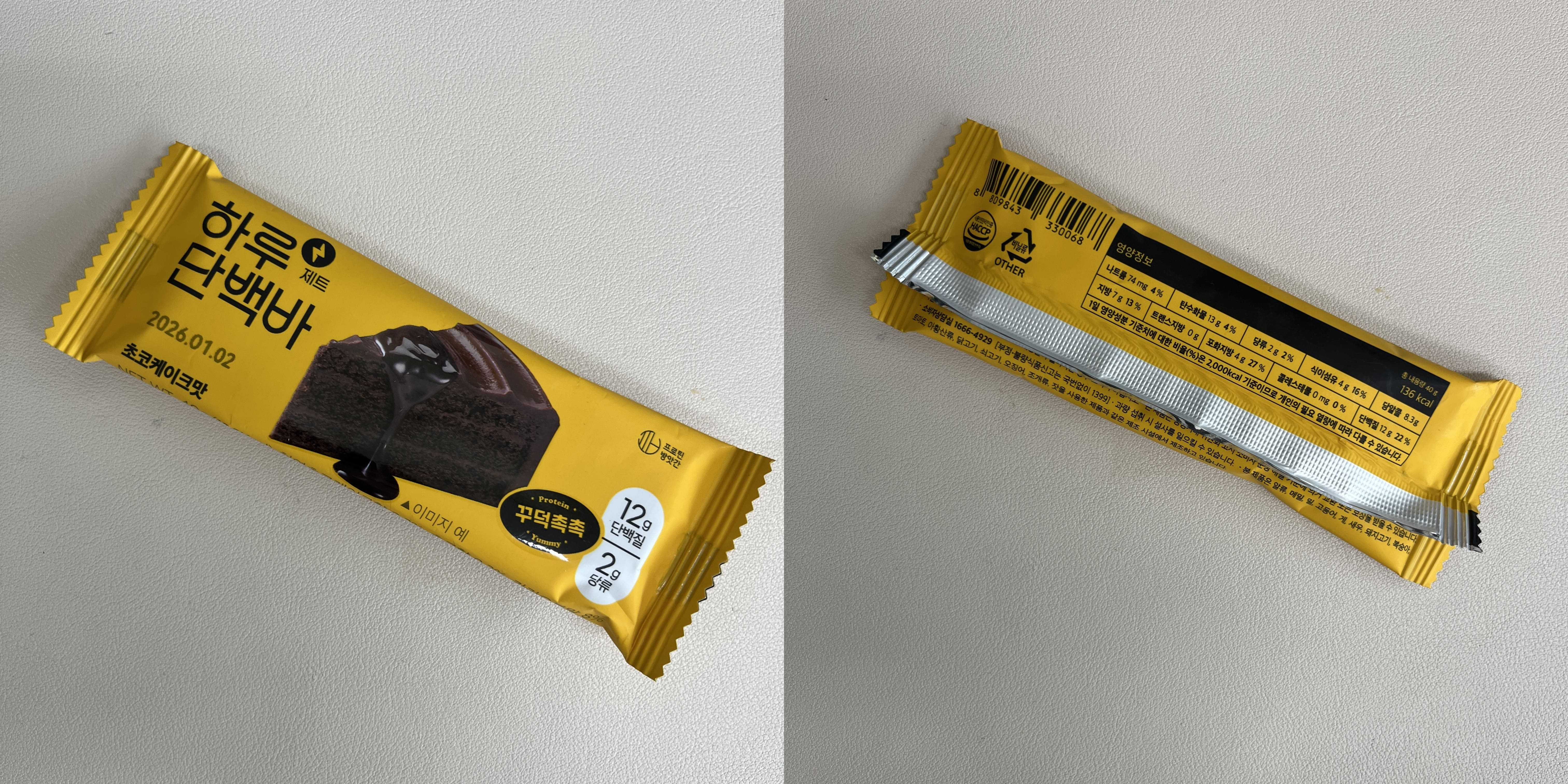 올리브영에 살 거 있어서 갔다가 발견한 단백질바 초코케이크맛. 일단 초코케이크맛이라는 거에 끌렸다. 그리고 저번에 램노쉬 쿠키도 맛있게 먹은 기억이 있어서 하나만 사볼까라는 생각으로 구매했다. 색깔은 눈에 띄고 포장도 좋고 무엇보다 겉에 있는 초코케이크맛 때문에 되게 맛있을 것 같다.