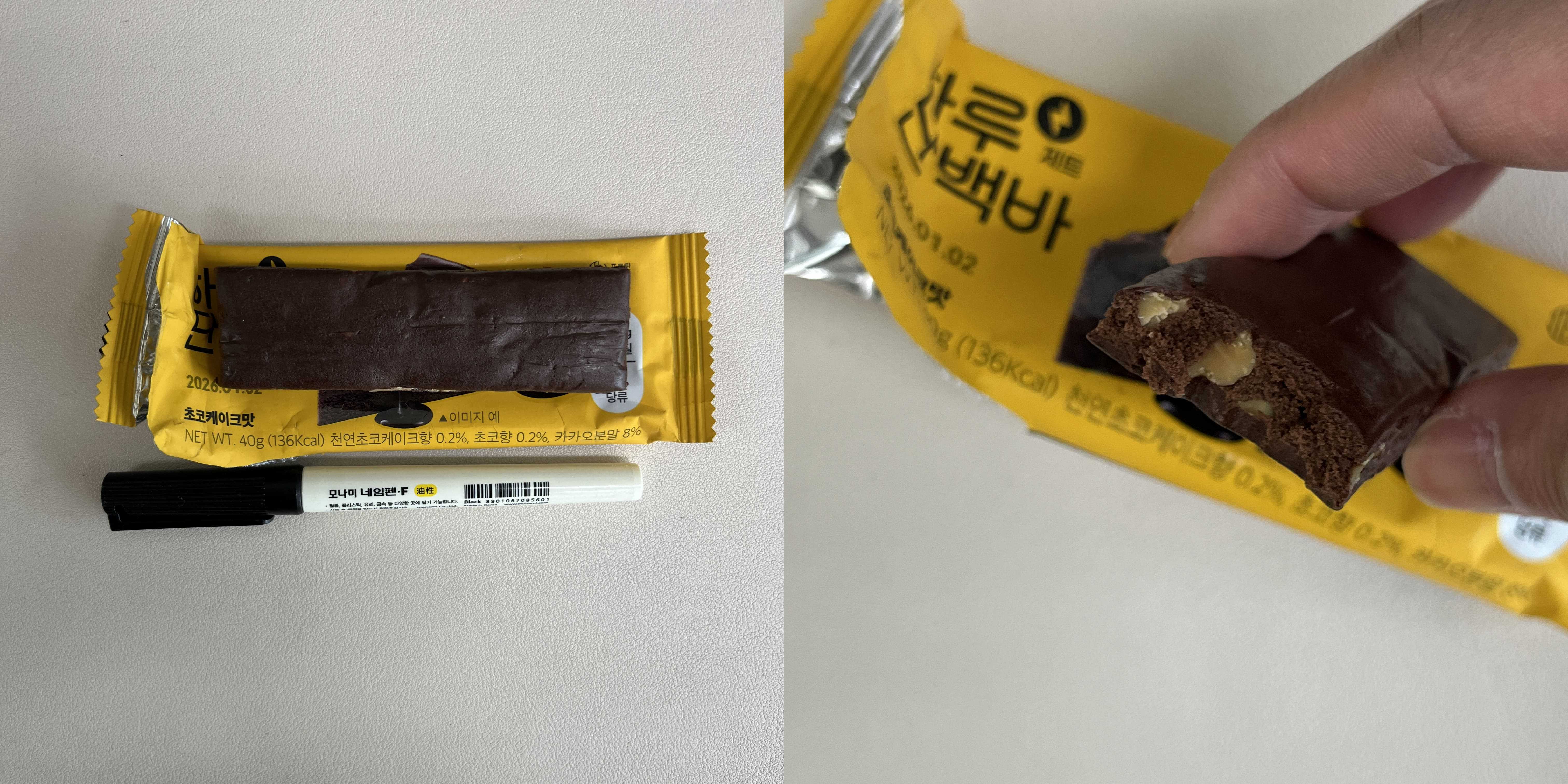 크기는 네임펜보다 조금 작은 길이고 생긴 건 정말 꾸덕하고 맛있게 생겼다. 안에는 볶은 아몬드와 호두가 있어서 고소한 맛을 살렸고 초코케이크 향이 은은하게 난다. 당은 대체재 당을 사용하였고 식이섬유도 들었다고 한다.