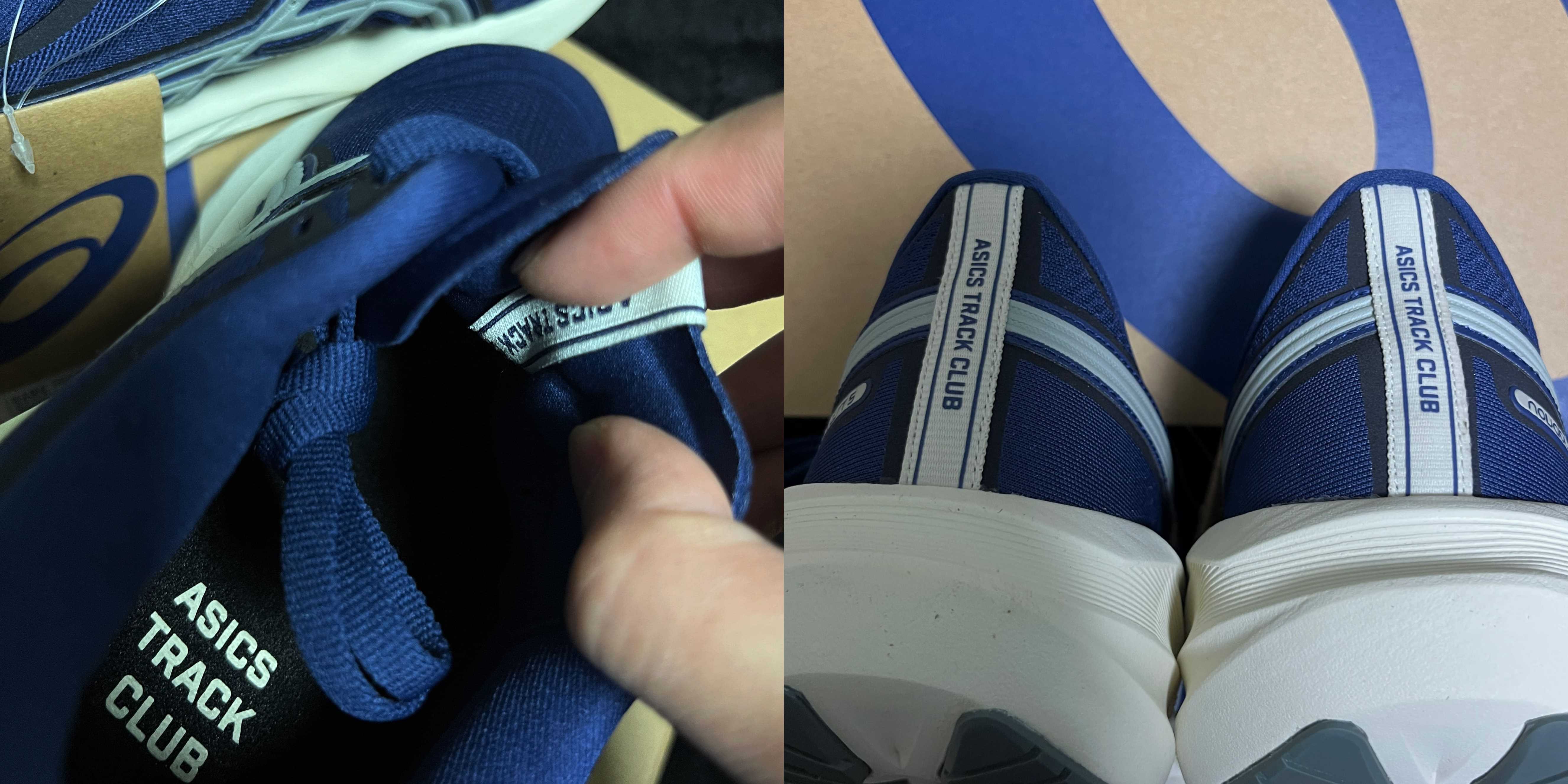 뒷축에 아식스 트랙 클럽이 쓰여있고, 혀 안쪽 탭에도 아식스 트랙 클럽이 쓰여있다.