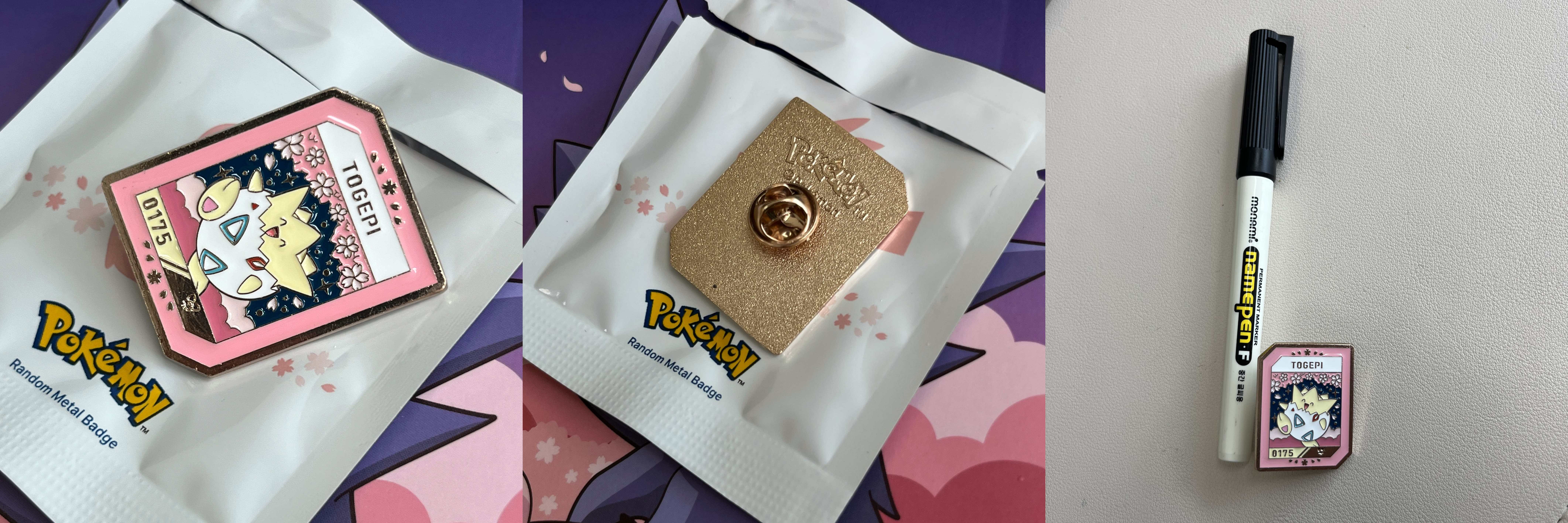 뱃지를 뜯었더니 짠. 하고 나온 것은 토게피 밤벚꽃...!! 잉어킹만 안 나왔으면 좋겠다라고 생각하고 있었는데 너무 귀여운 애가 나왔다. 밤벚꽃이라니 낭만적이다. 뒤태도 마감을 잘해서 보기가 좋았고 색감도 예뻤다. 크기는 네임펜이랑 비교하면 저 정도 사이즈다. 토스트도 맛있게 잘 먹고 귀여운 게 나와서 좋다!