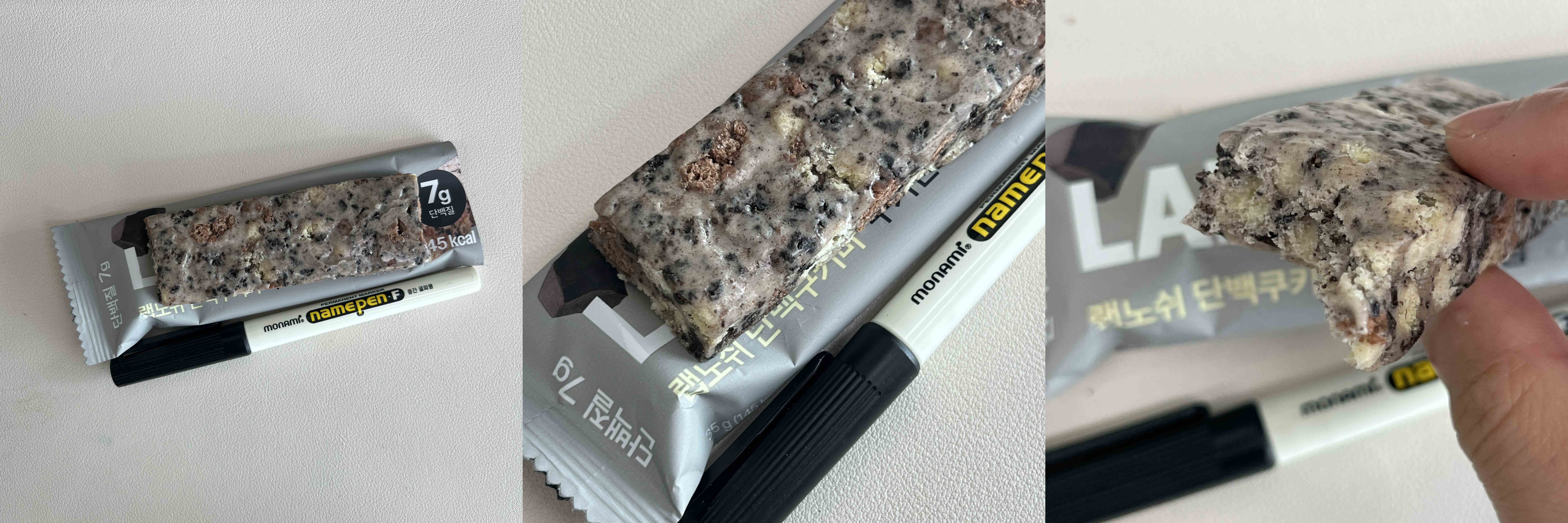 크기는 네임펜 크기보다 조금 안 되는 한 4/5 크기 정도 된다. 안에 내용은 알차다. 애초에 좀 딱딱한 식감이라서 상온보관이 낫다. 일부 단백쿠키바는 끈적거림도 있는데 랩노쉬 단백쿠키바는 그런 것도 적고 괜찮은 맛이었다.