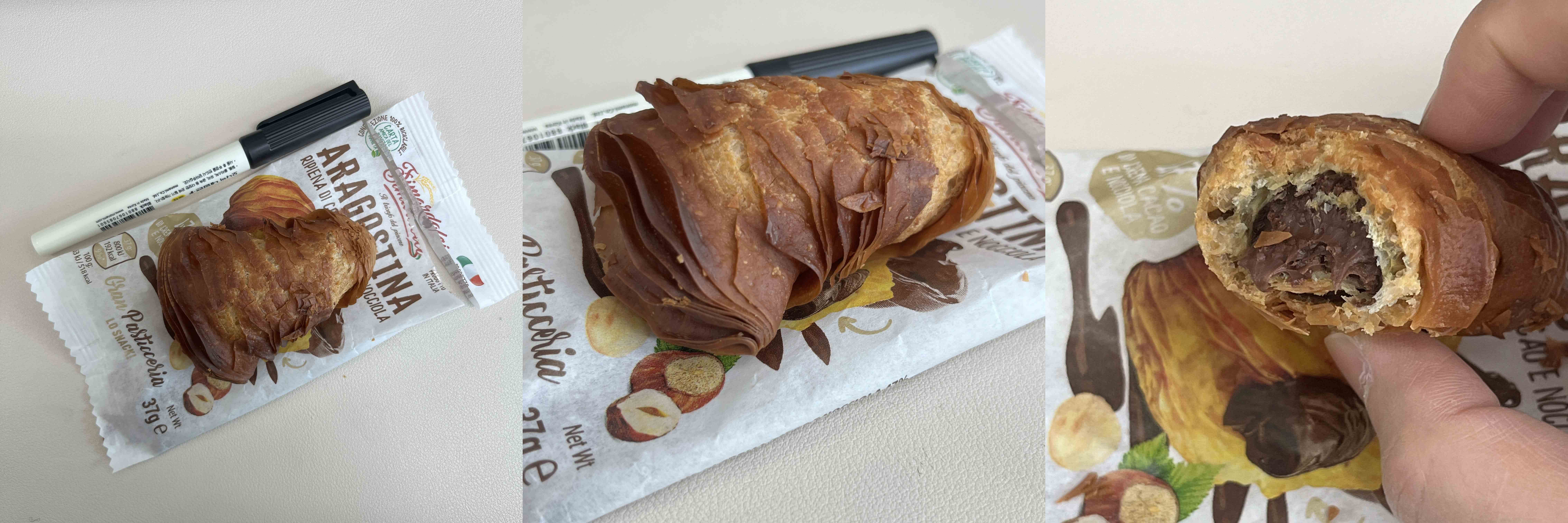 원래는 gs25에서만 팔았다고 들었는데 이제 다른 곳에서도 파나보다. 원산지는 이탈리아다. 코코아분말과 헤이즐넛이 들어간 크림이고 겉은 페스츄리고, 버터 대신 마가린이 사용된 것 같다. 마치 크로와상 같은 생김새고 신기해서 구입해 봤다.